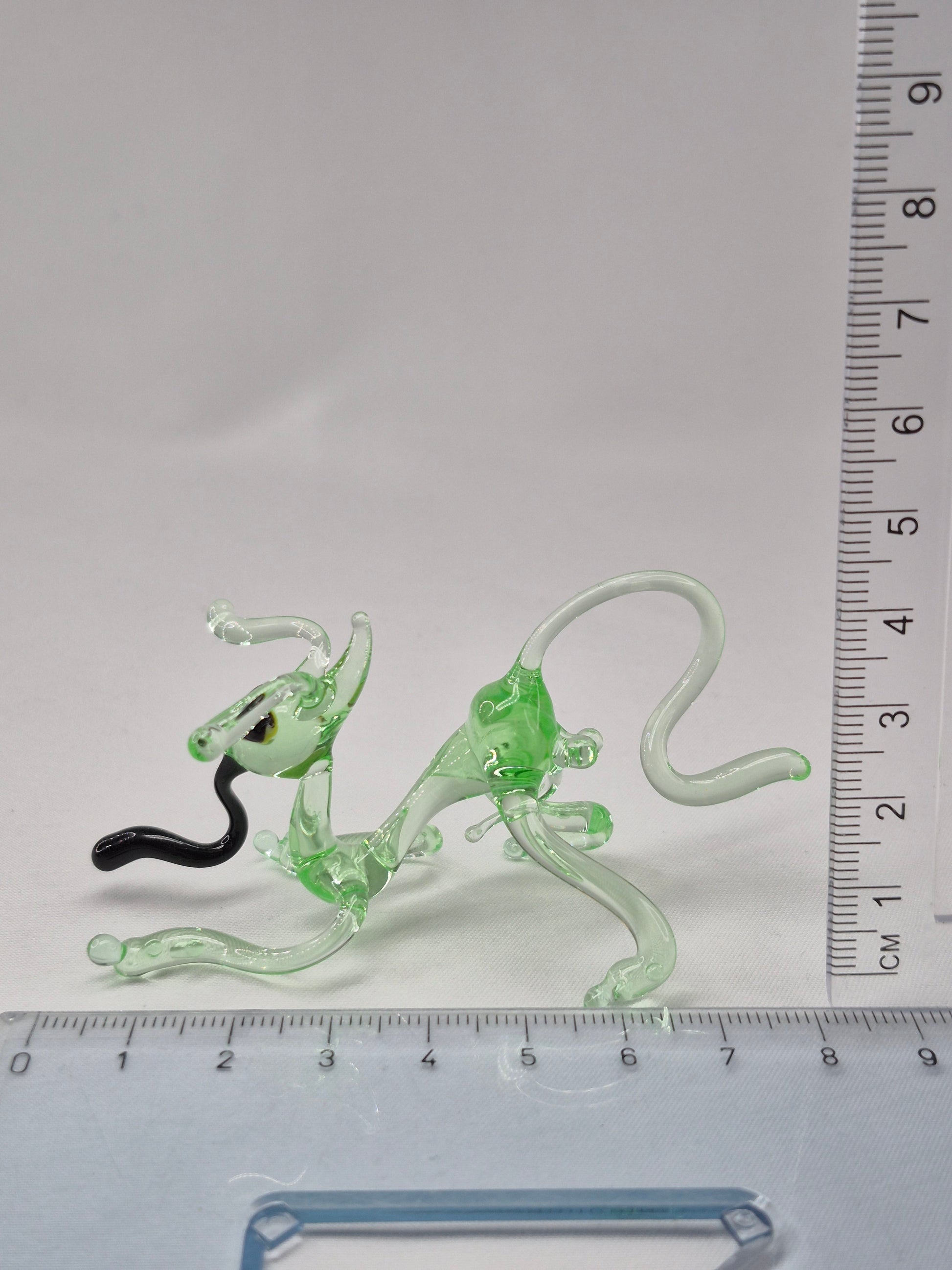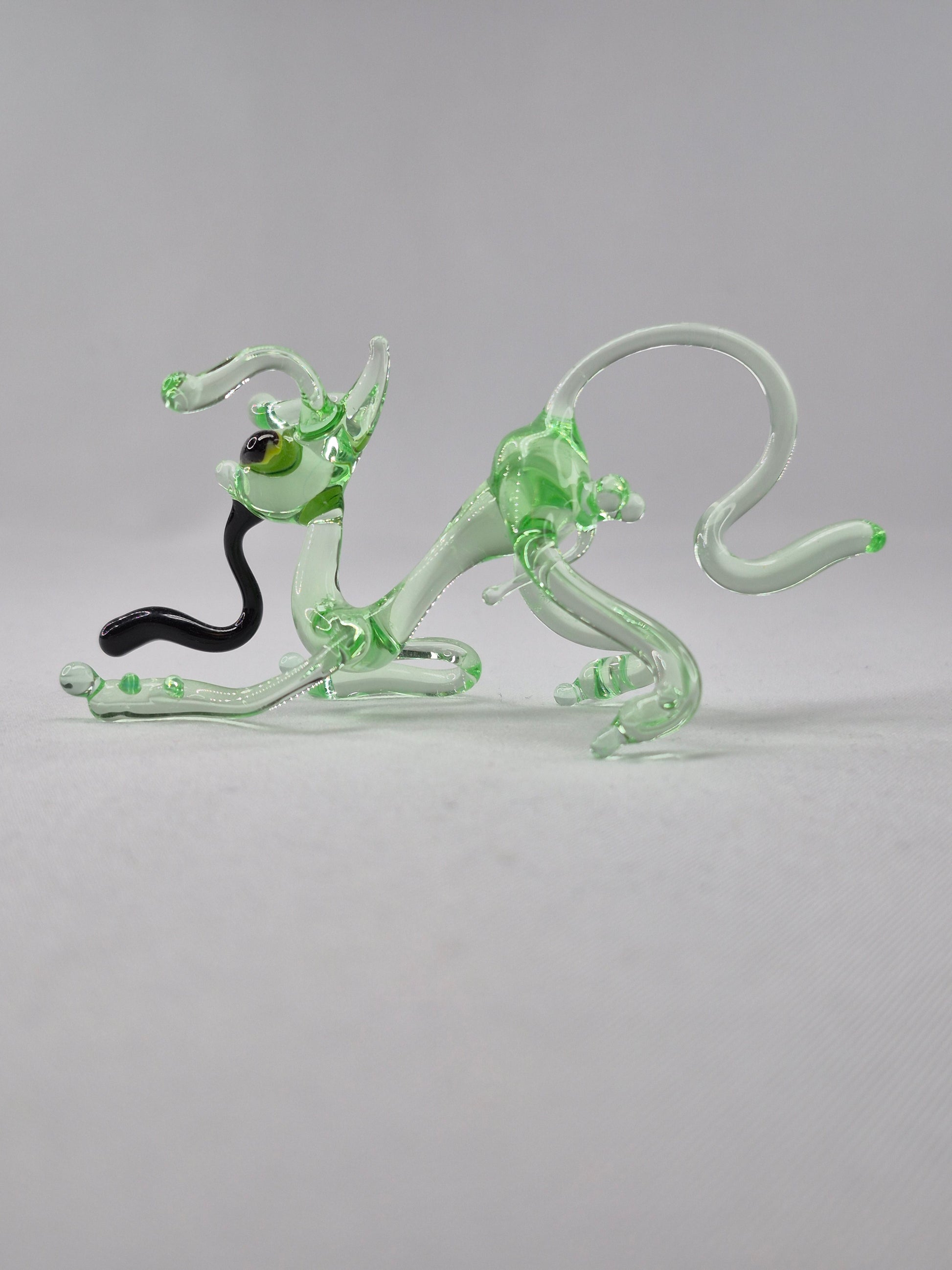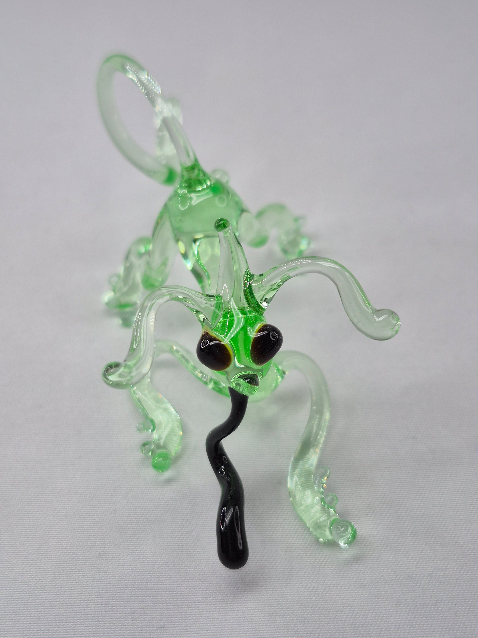 A unique alien dog figurine made from uranium borosilicate glass, handcrafted in the lampwork technique, where glass rods are melted in an open flame and shaped entirely by hand without molds.