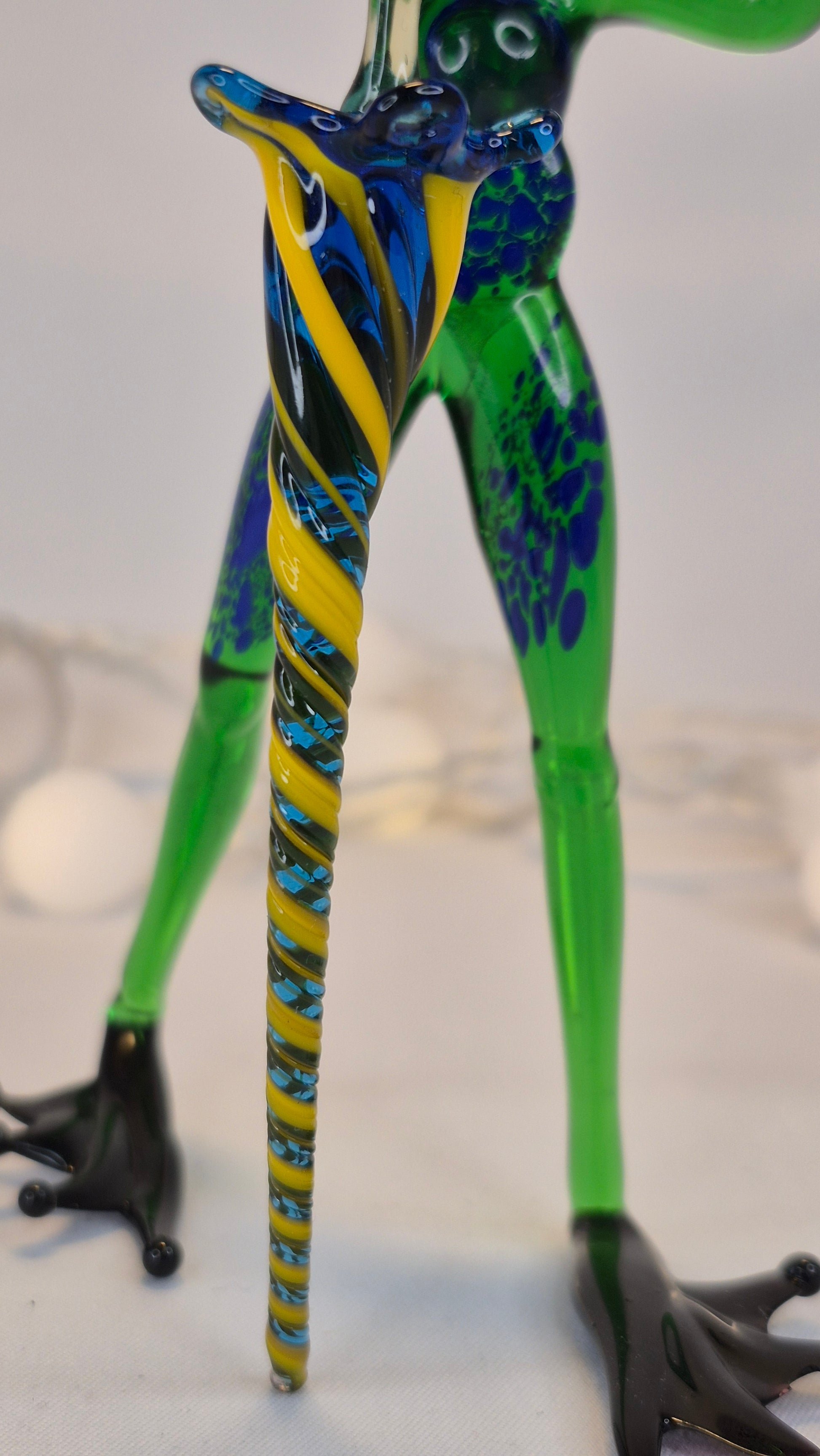A glass frog with an aristocratic charm. Handmade in the lampwork technique — a traditional glassworking method where glass rods are heated in an open flame and carefully shaped by hand with special tools. This technique allows the creation of detailed and expressive figurines without the use of molds, making each piece truly unique.