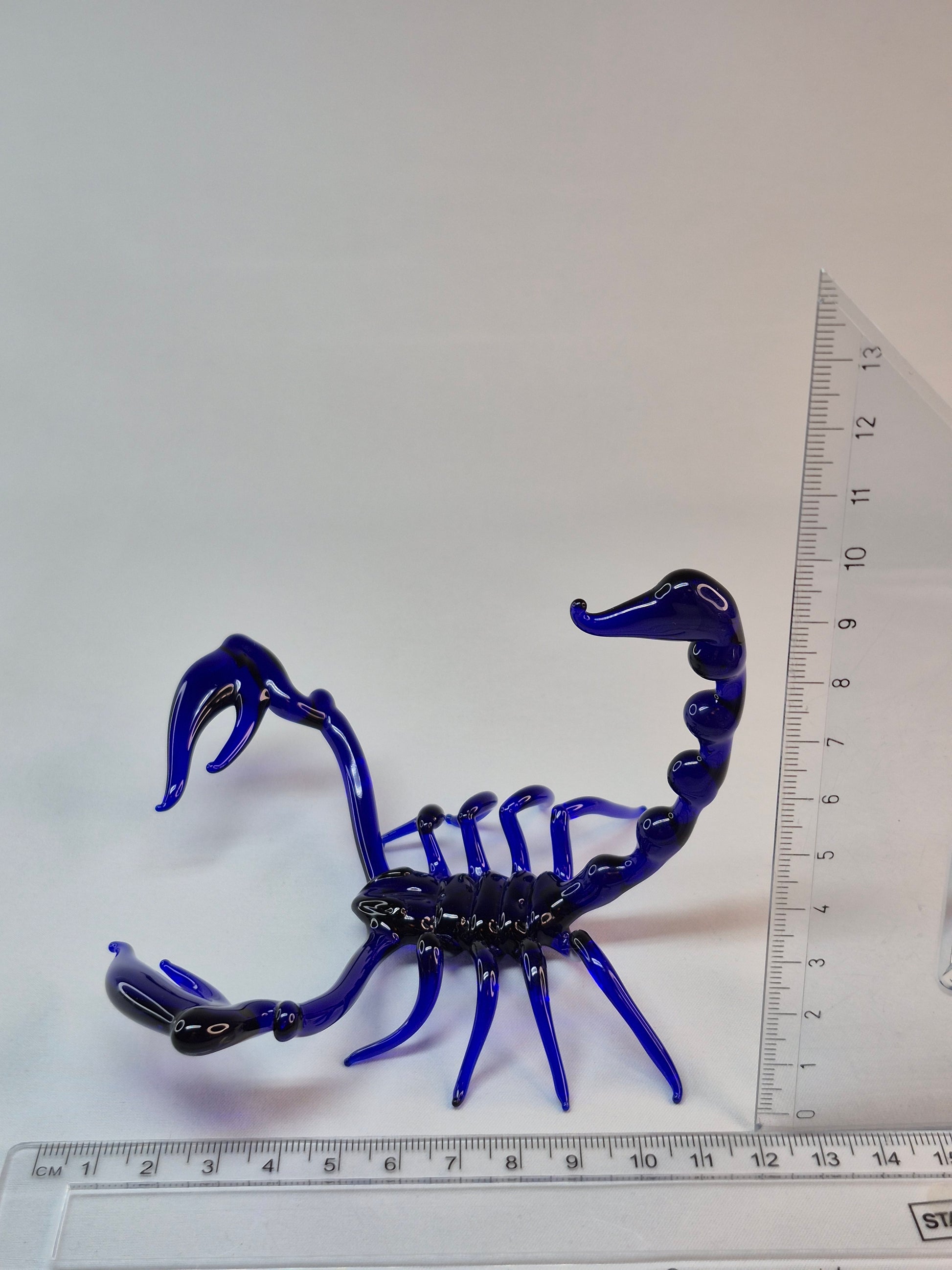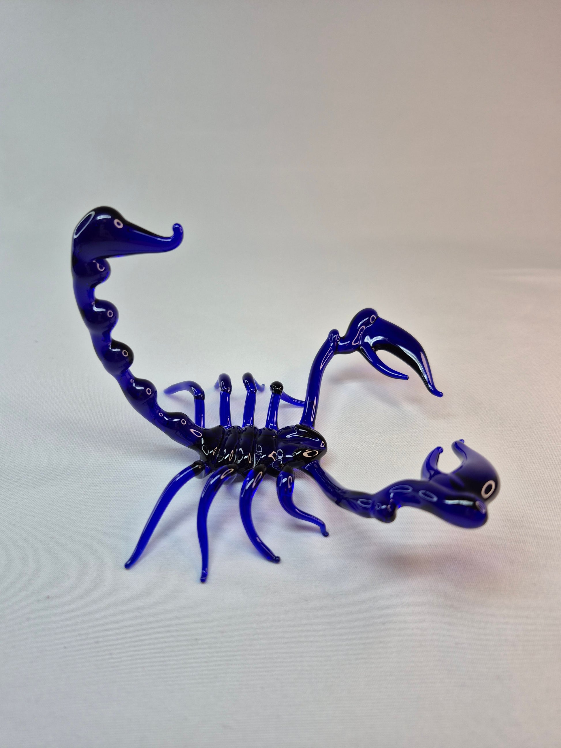 A striking blue glass scorpion, handmade in the lampwork technique, where glass rods are melted in an open flame and shaped by hand without molds.