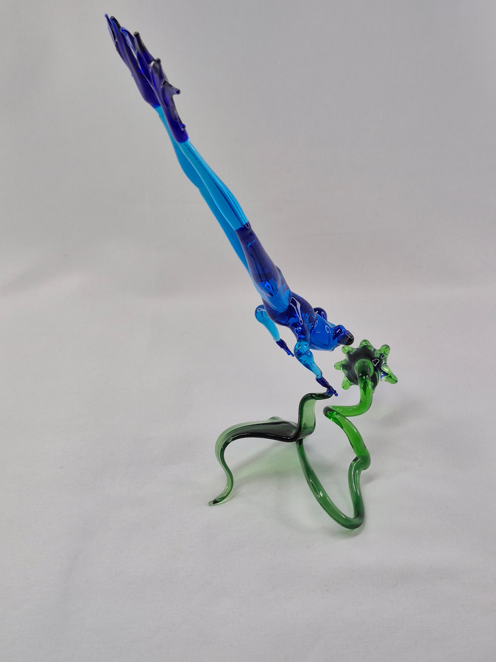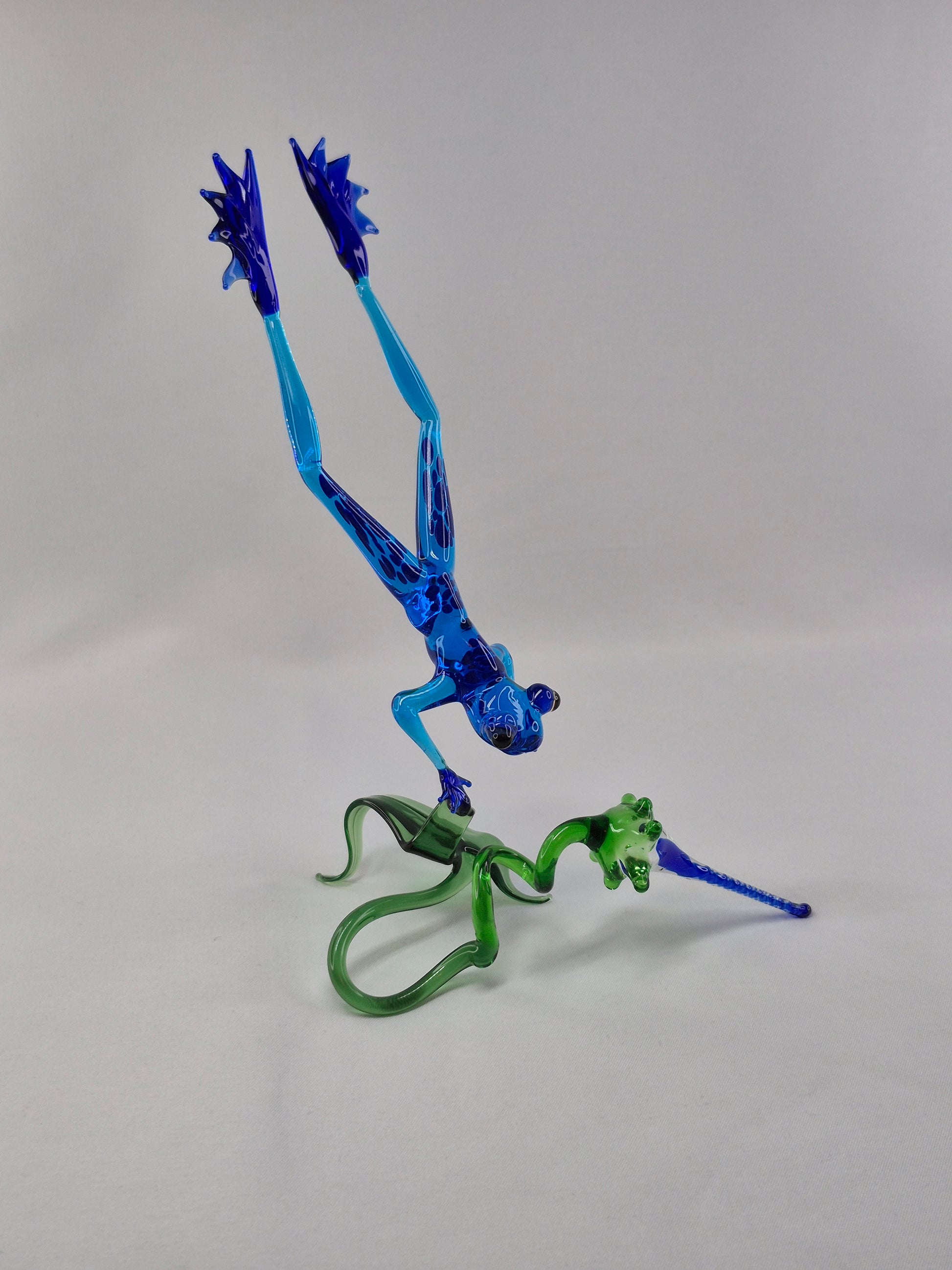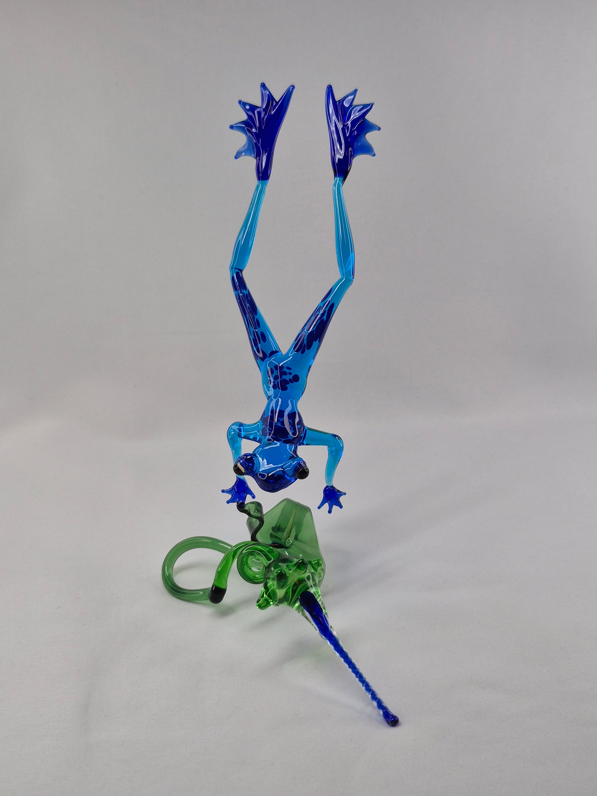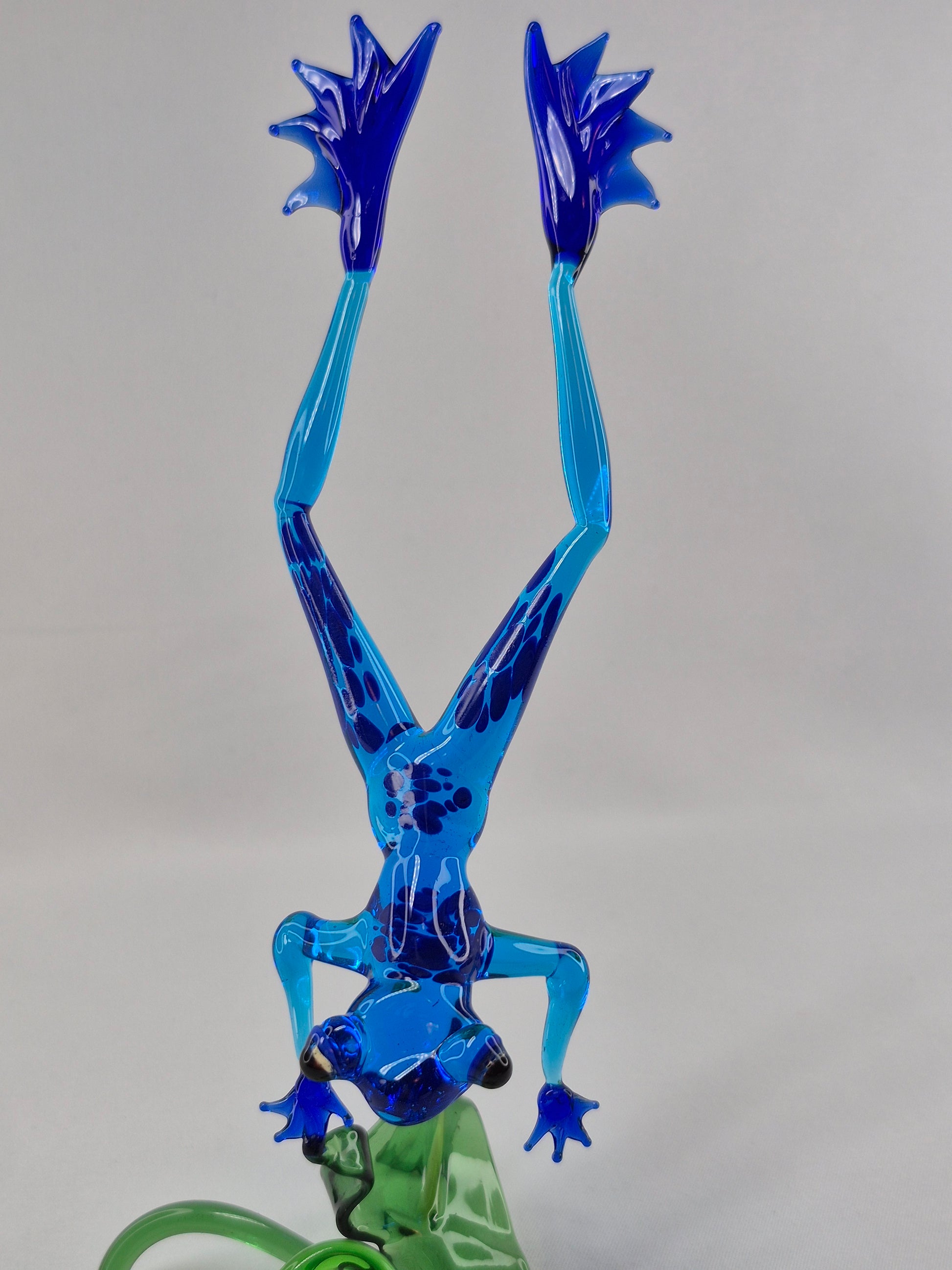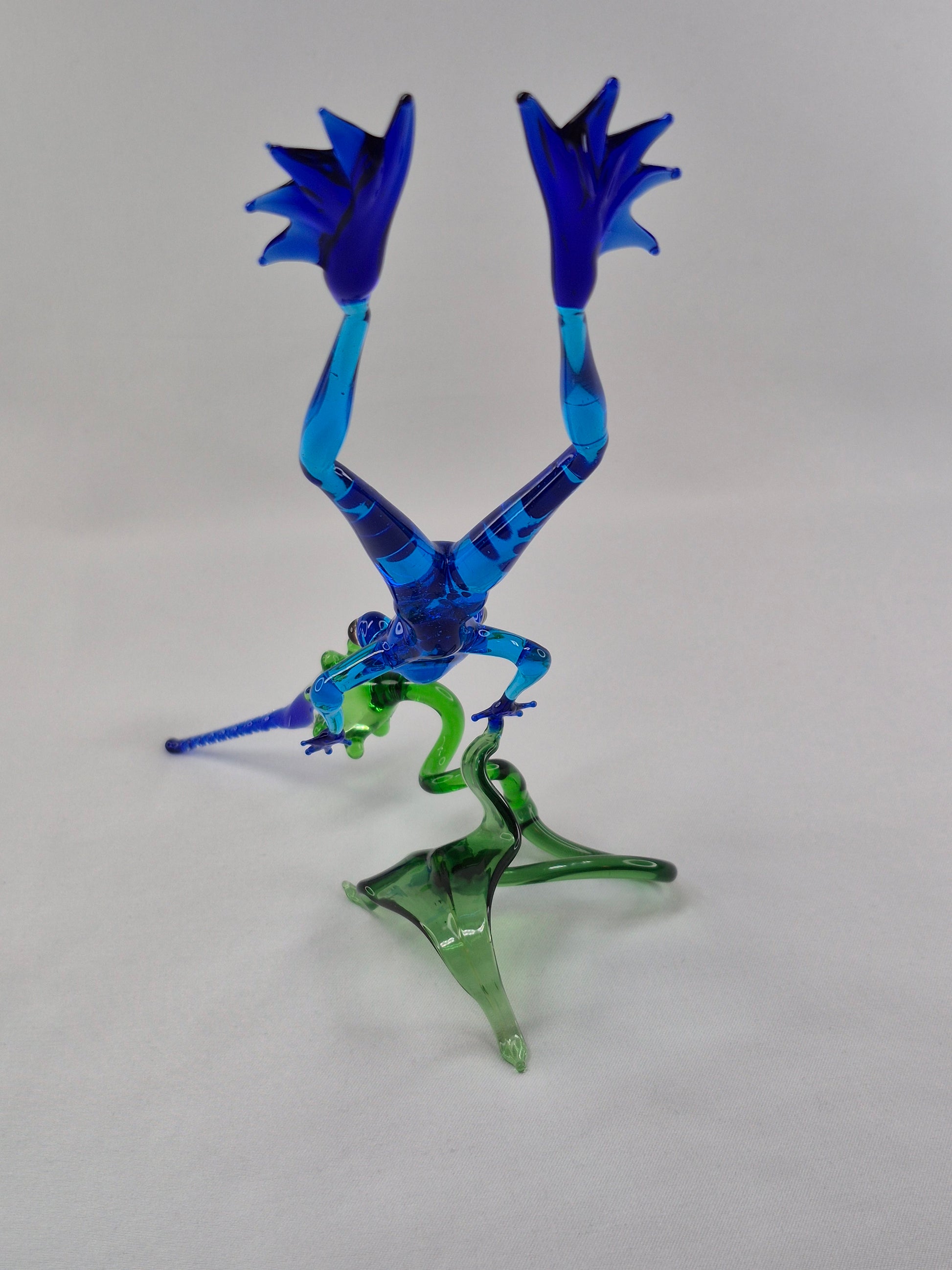 A stunning blue glass frog jumping onto a flower, handcrafted in the lampwork technique, where glass rods are melted in an open flame and shaped by hand without molds.