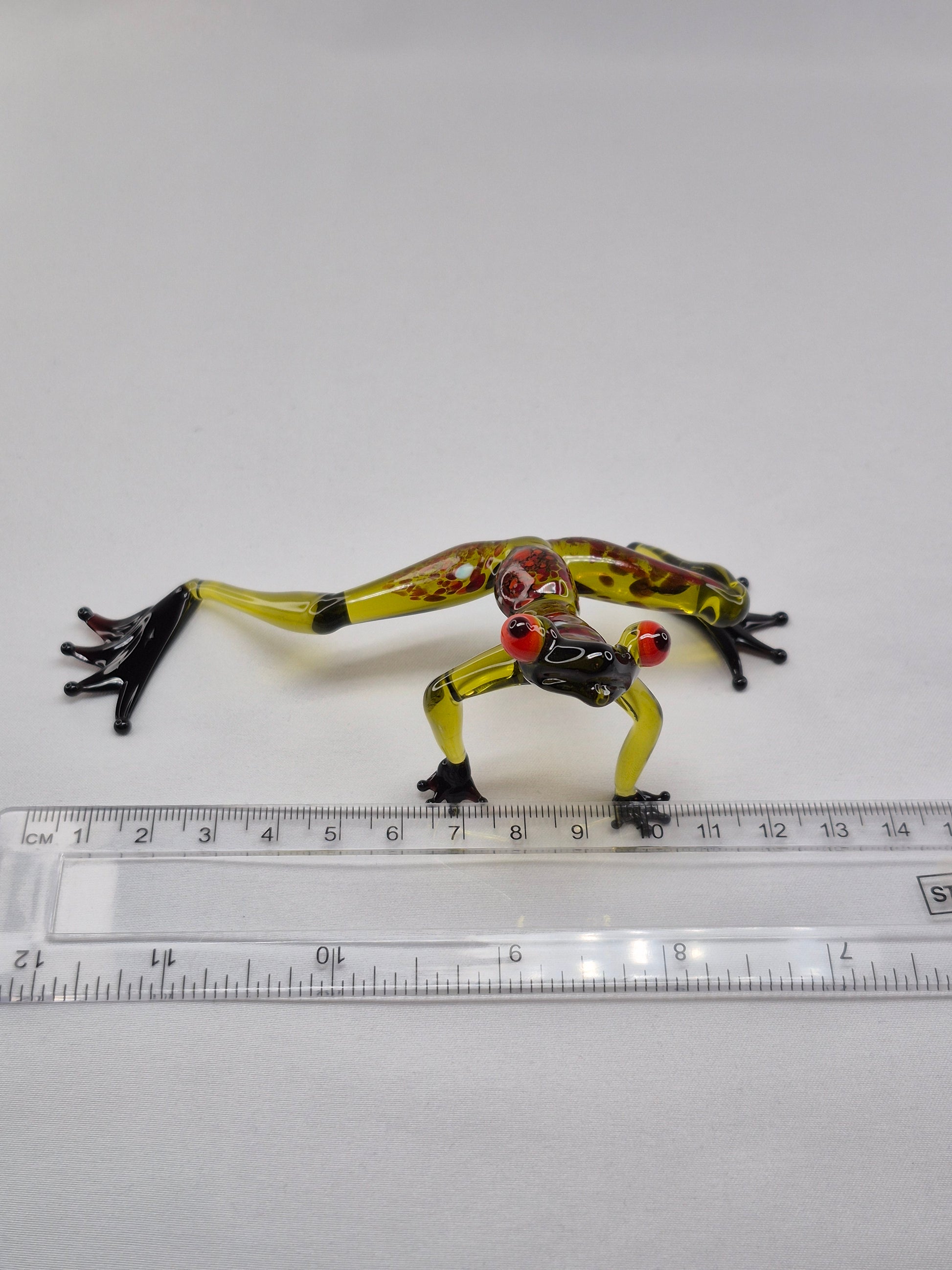 An elegant dark green glass frog, handcrafted in the lampwork technique, where glass rods are melted in an open flame and shaped by hand without molds.