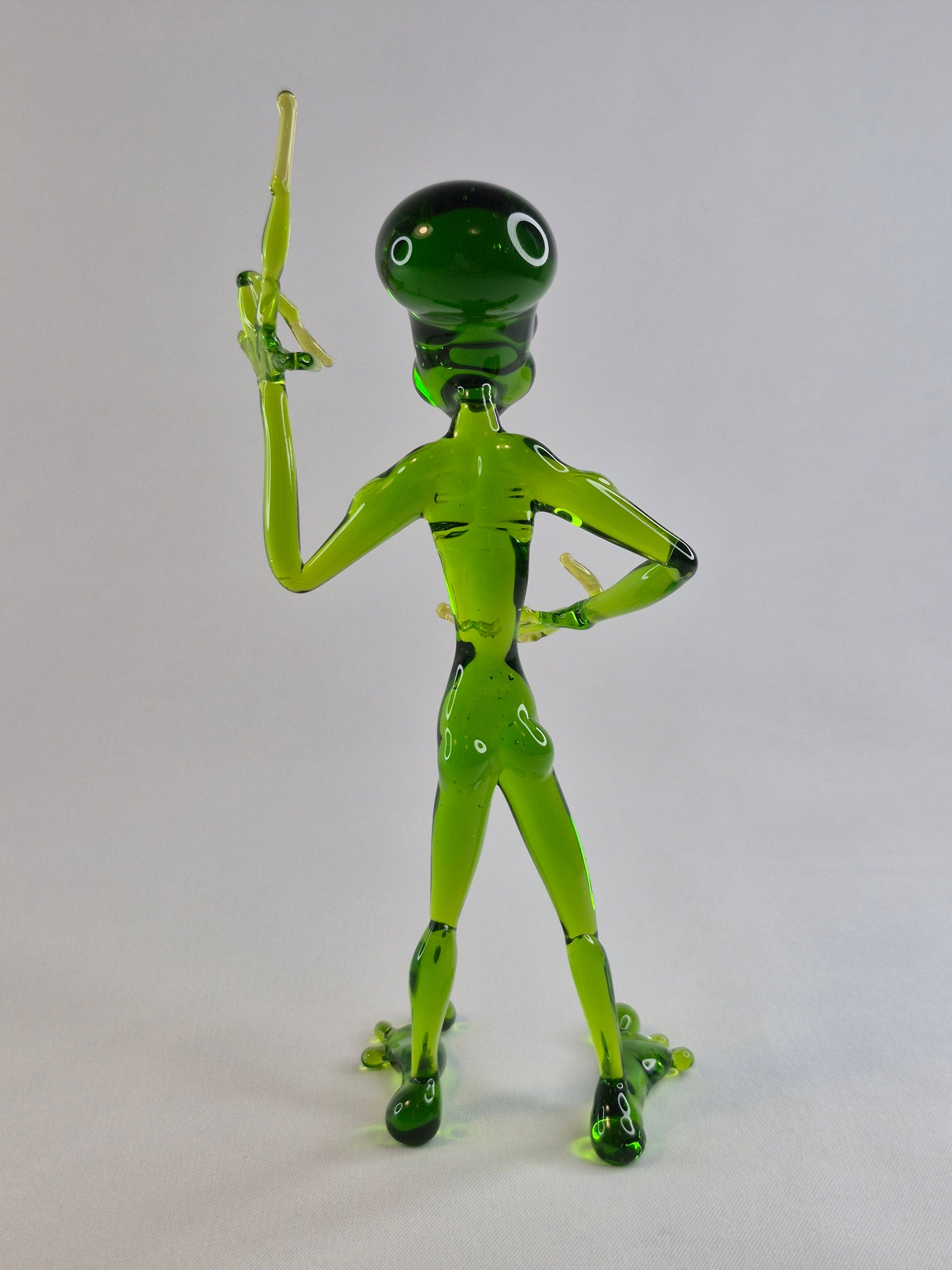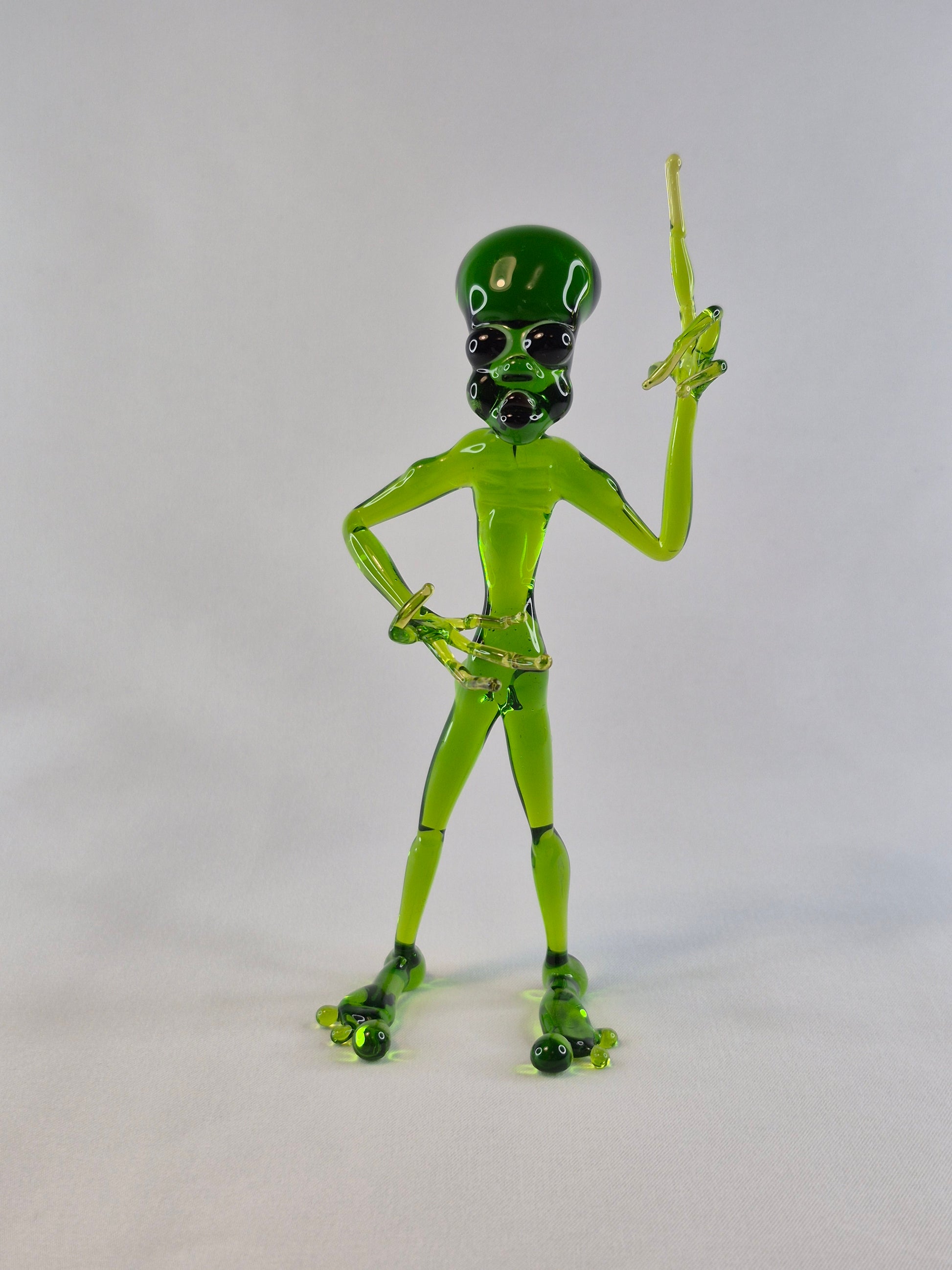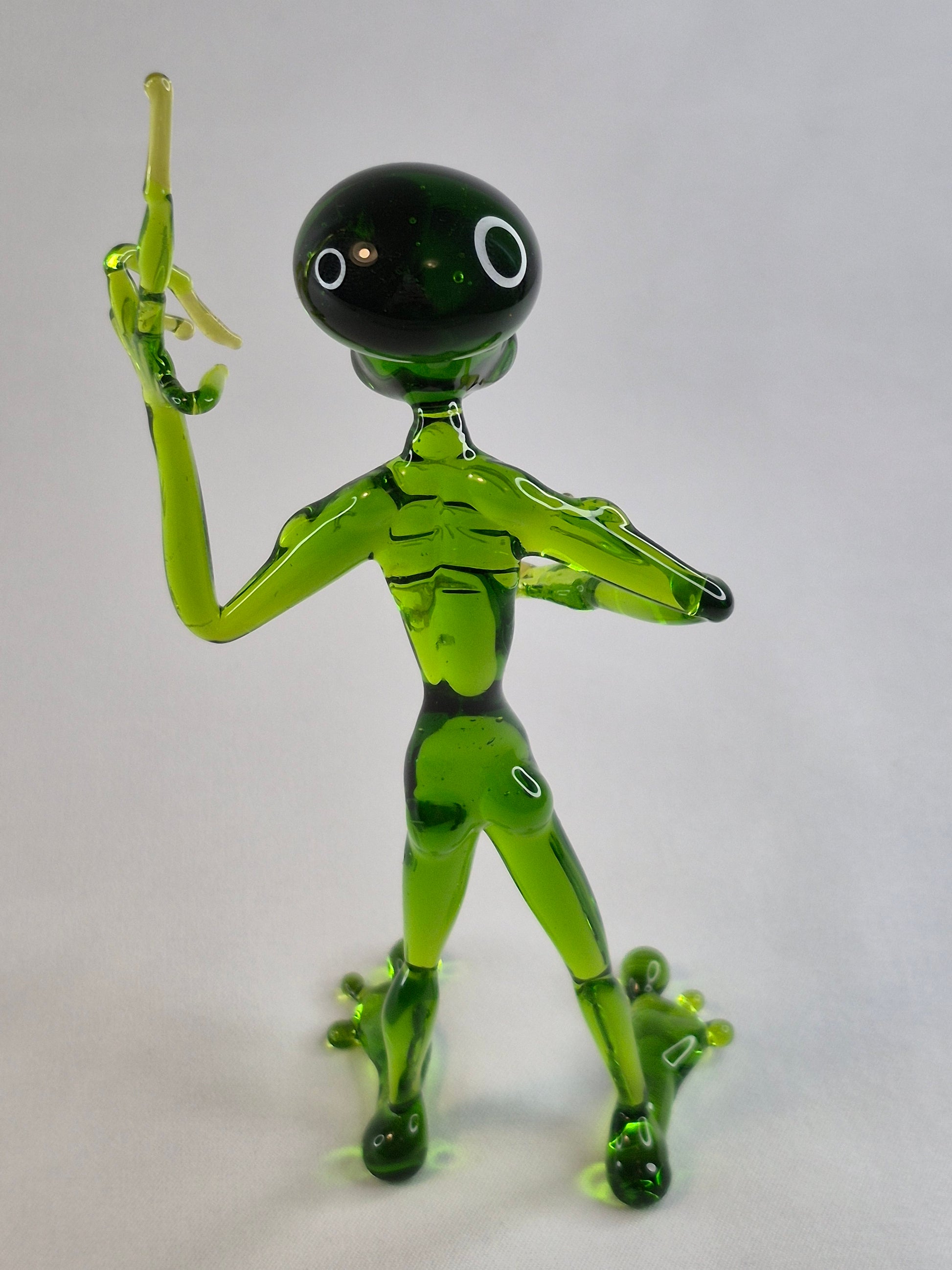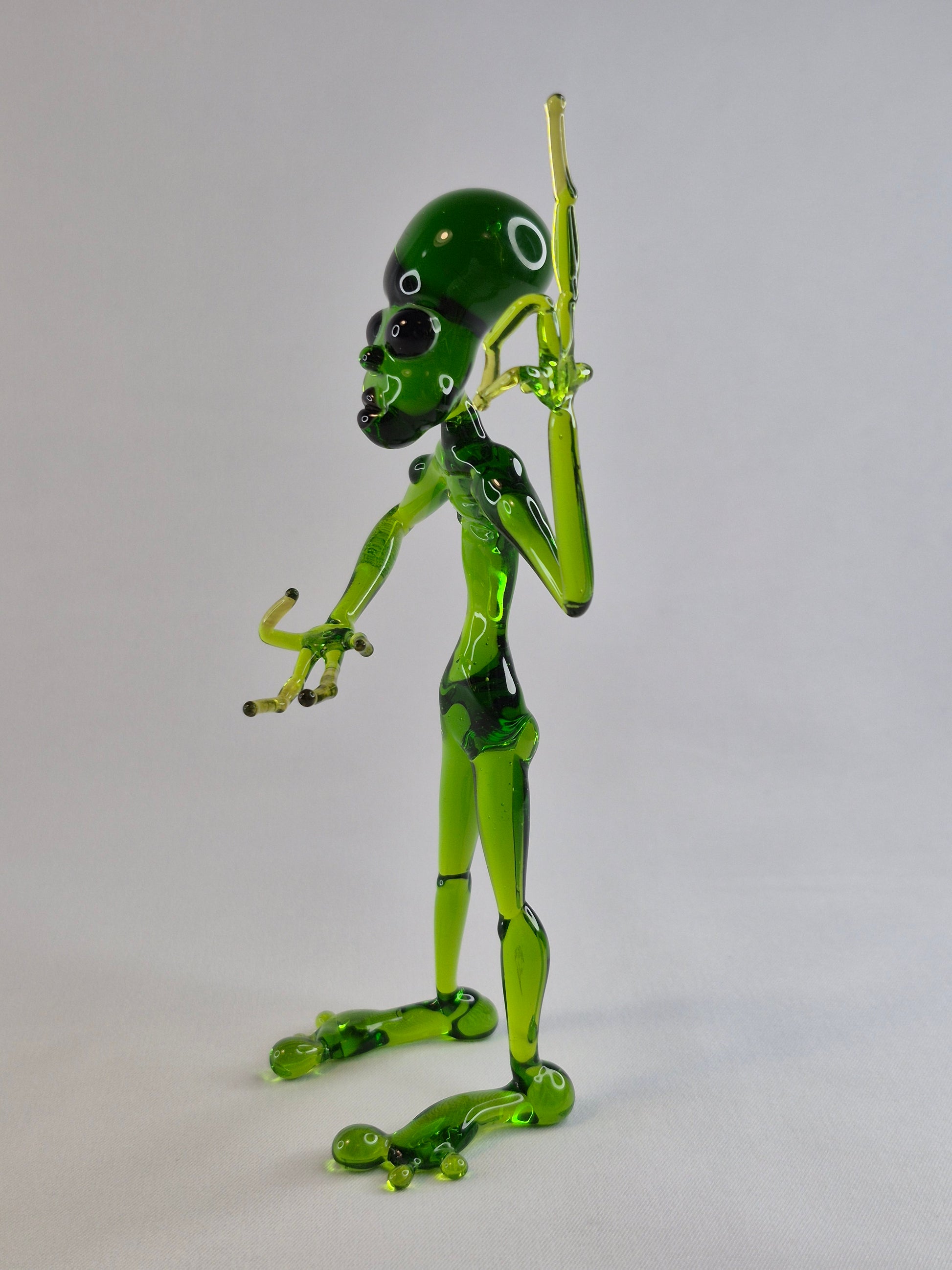 A unique glass alien figurine, handcrafted in the lampwork technique, where glass rods are melted in an open flame and shaped by hand without molds. Its playful design and detailed form make it a fun and eye-catching piece of art.