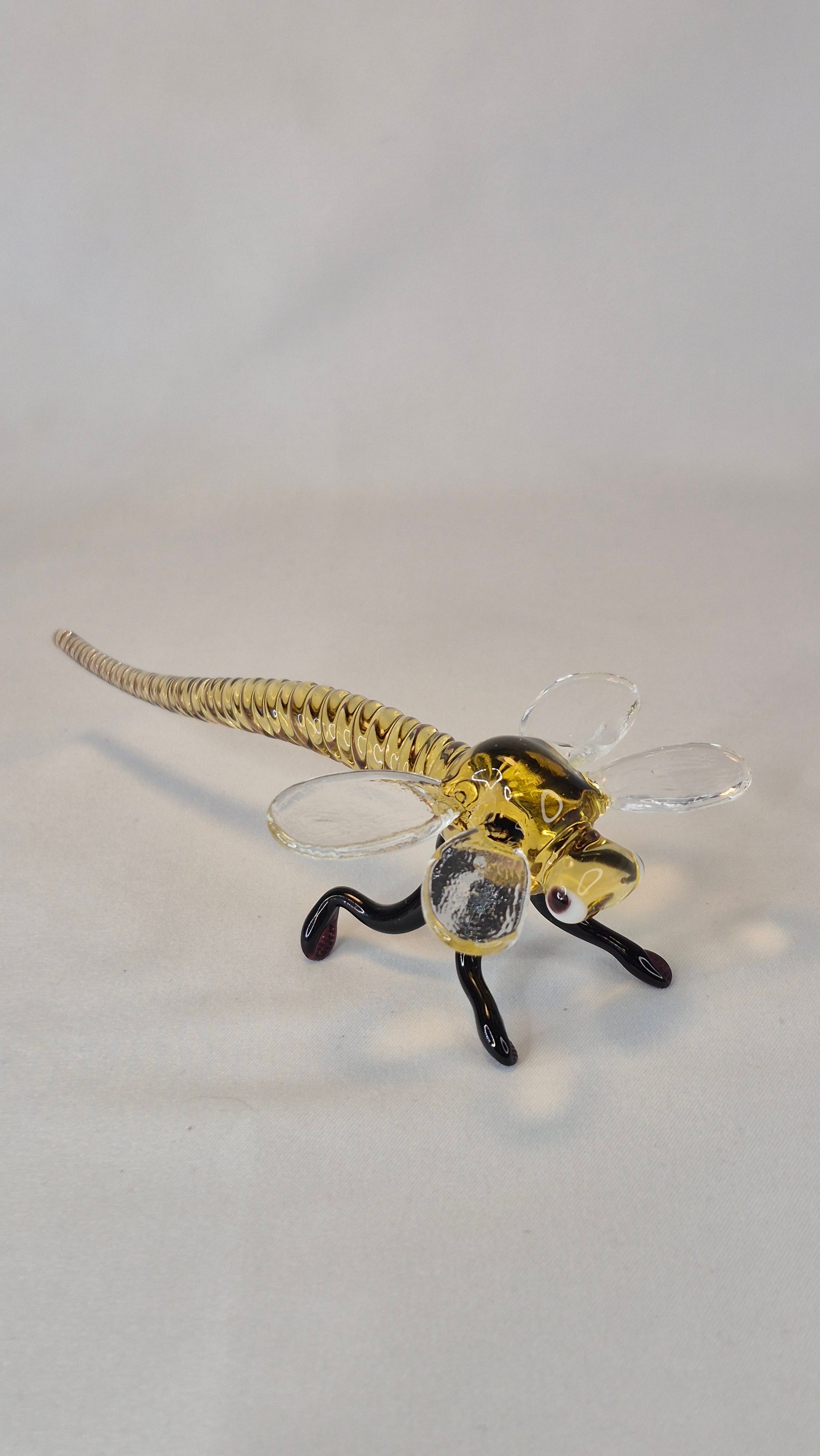 A handmade glass dragonfly. Crafted in the lampwork technique — a traditional glassworking method where glass rods are heated in an open flame and carefully shaped by hand with special tools. This technique allows the creation of detailed and expressive figurines without the use of molds, making each piece truly unique.