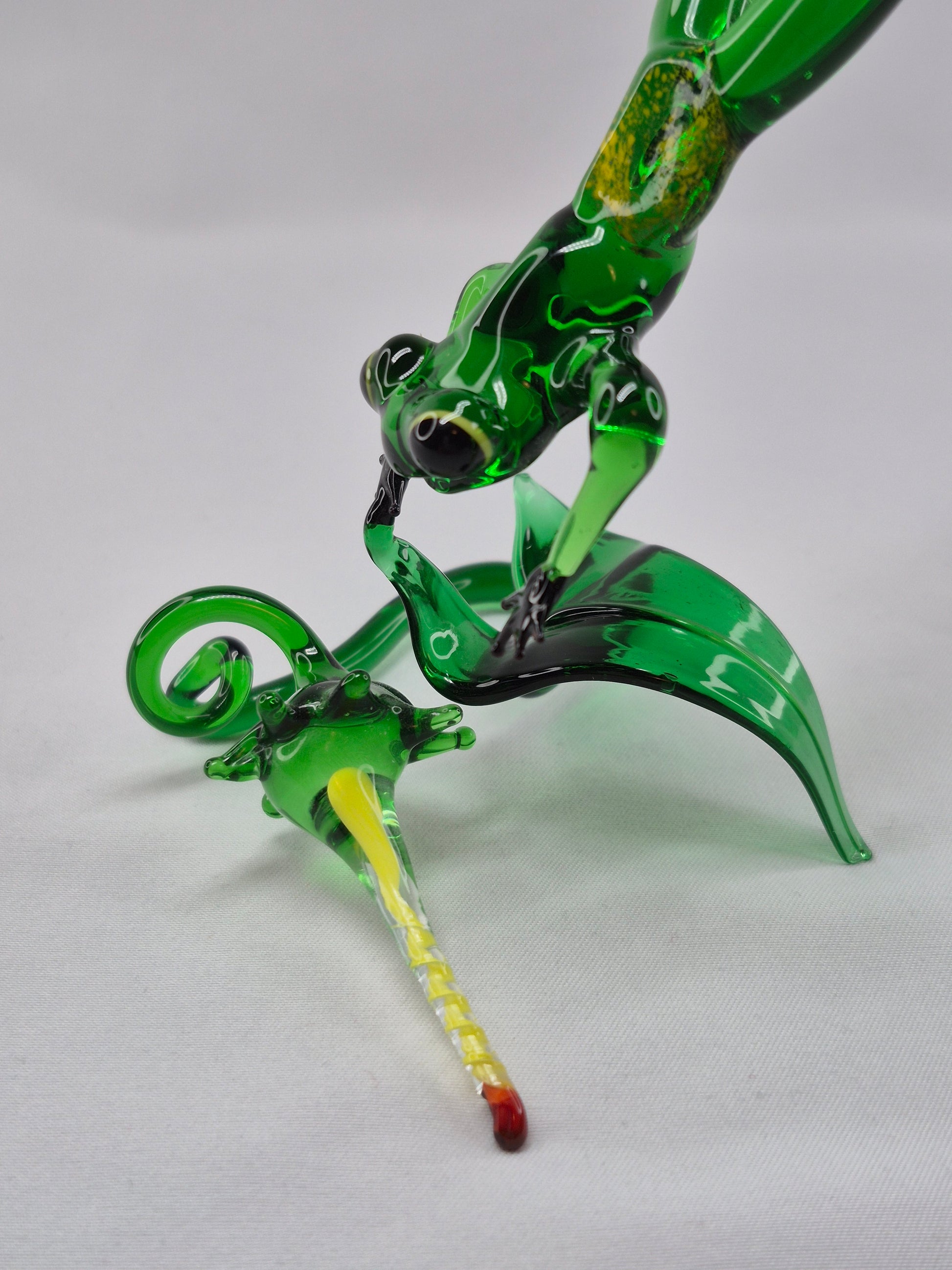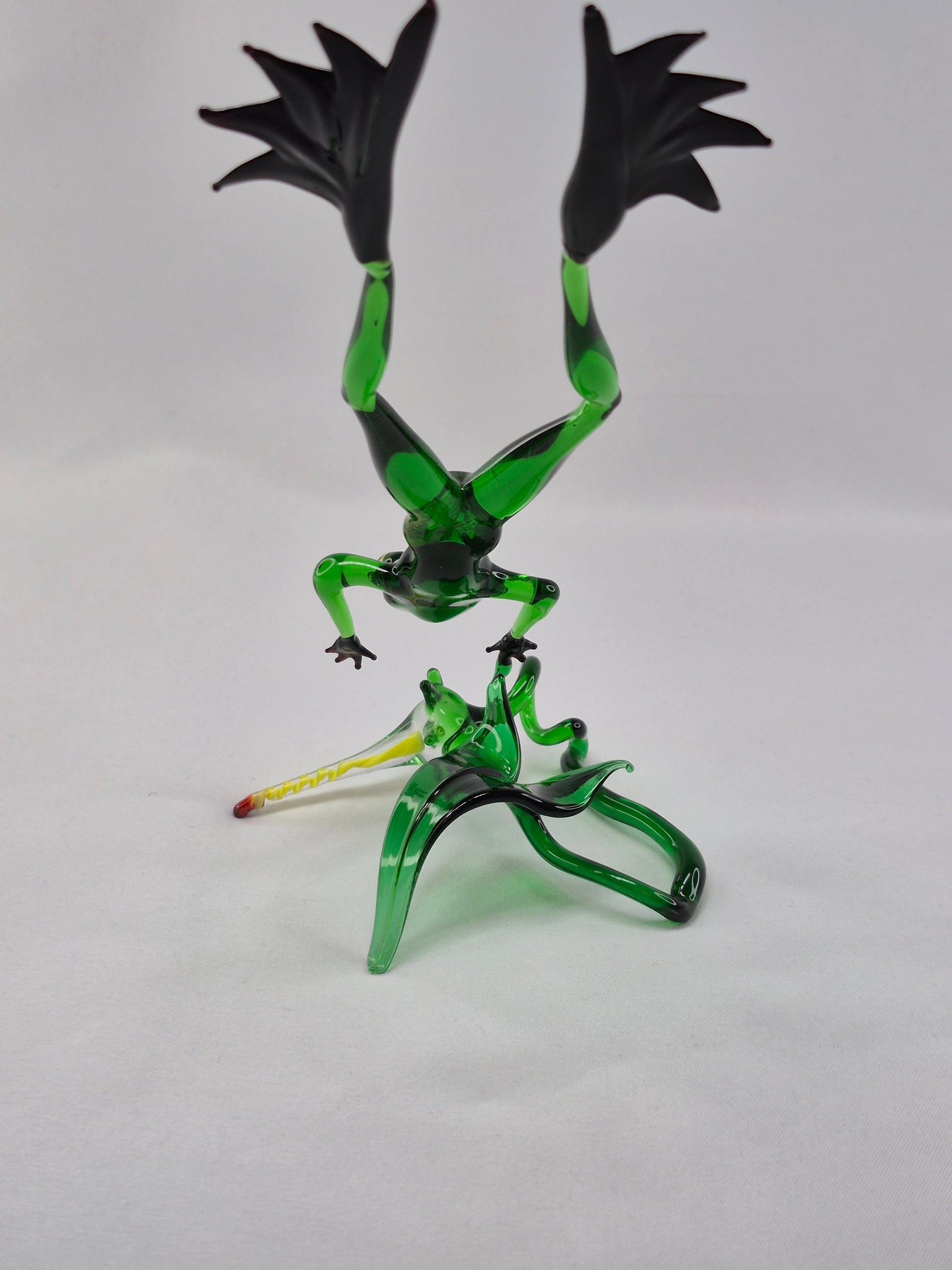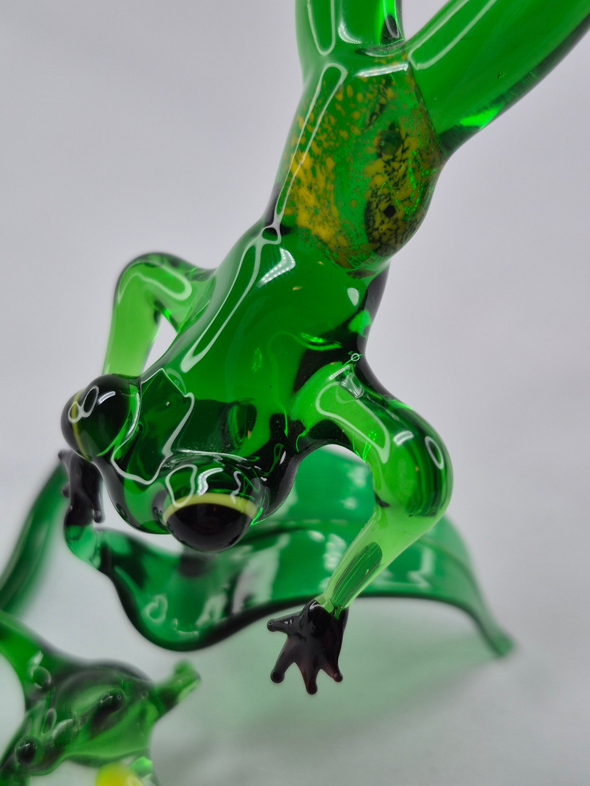 A stunning green glass frog jumping onto a flower, handcrafted in the lampwork technique, where glass rods are melted in an open flame and shaped by hand without molds.