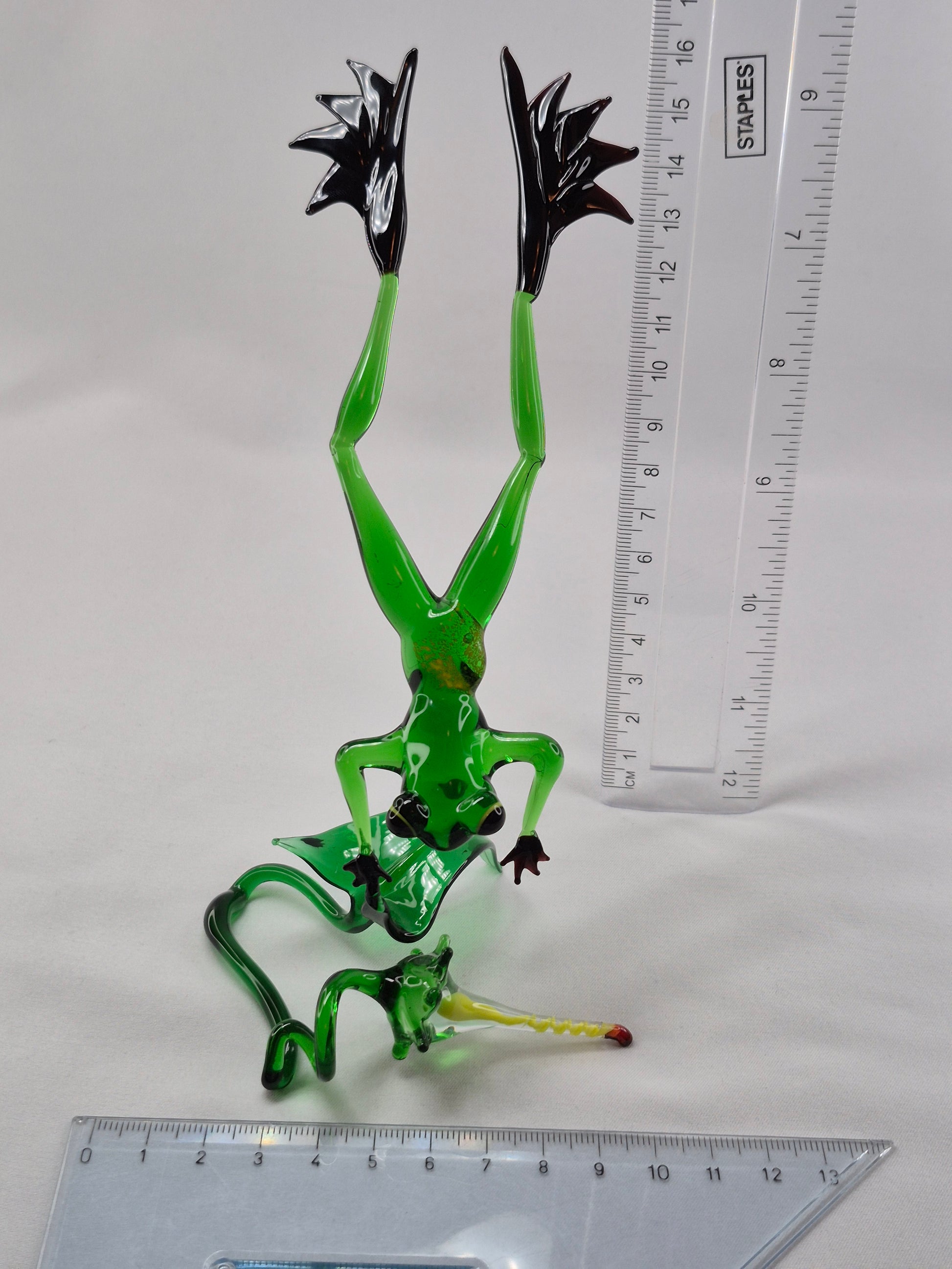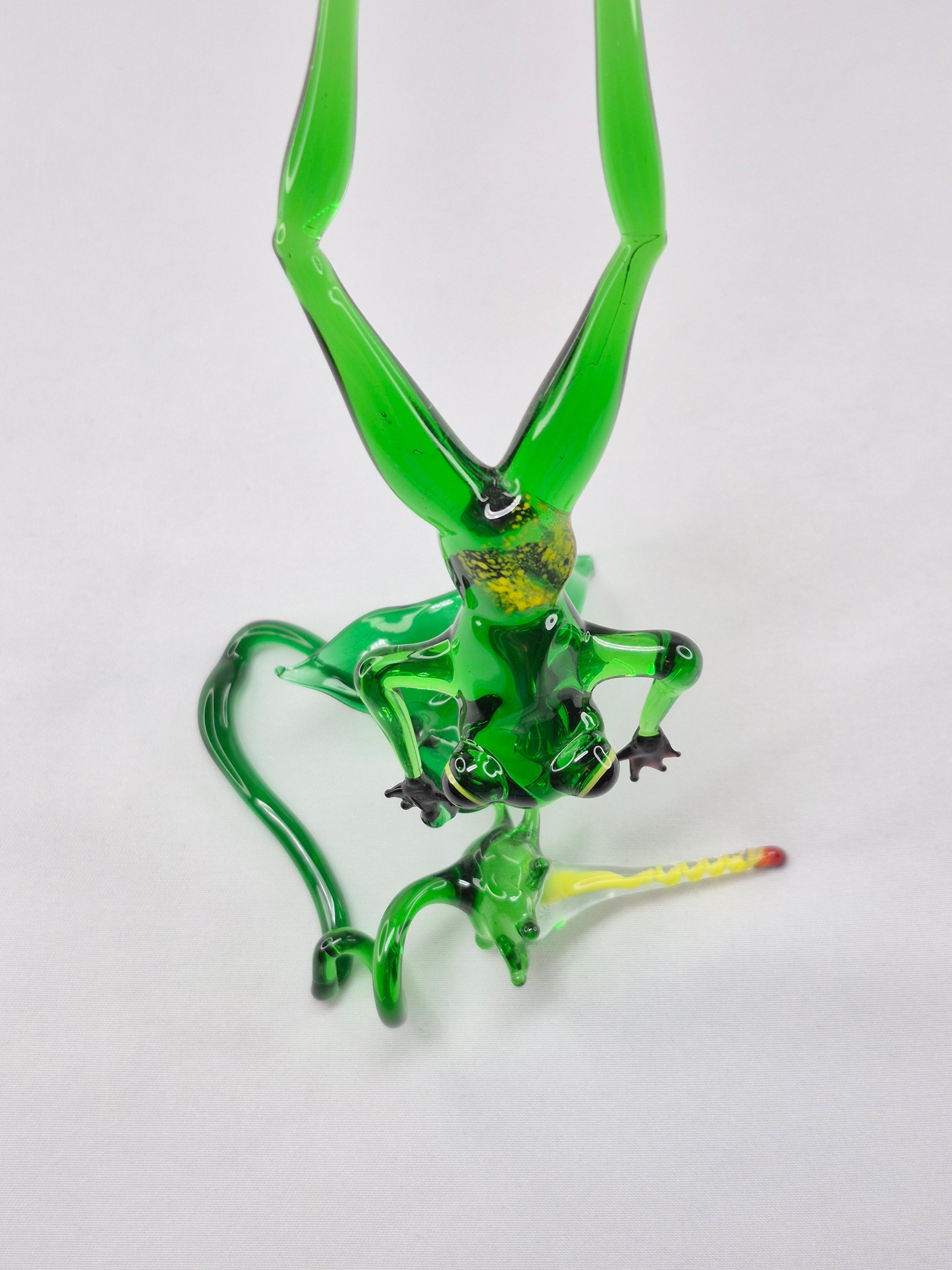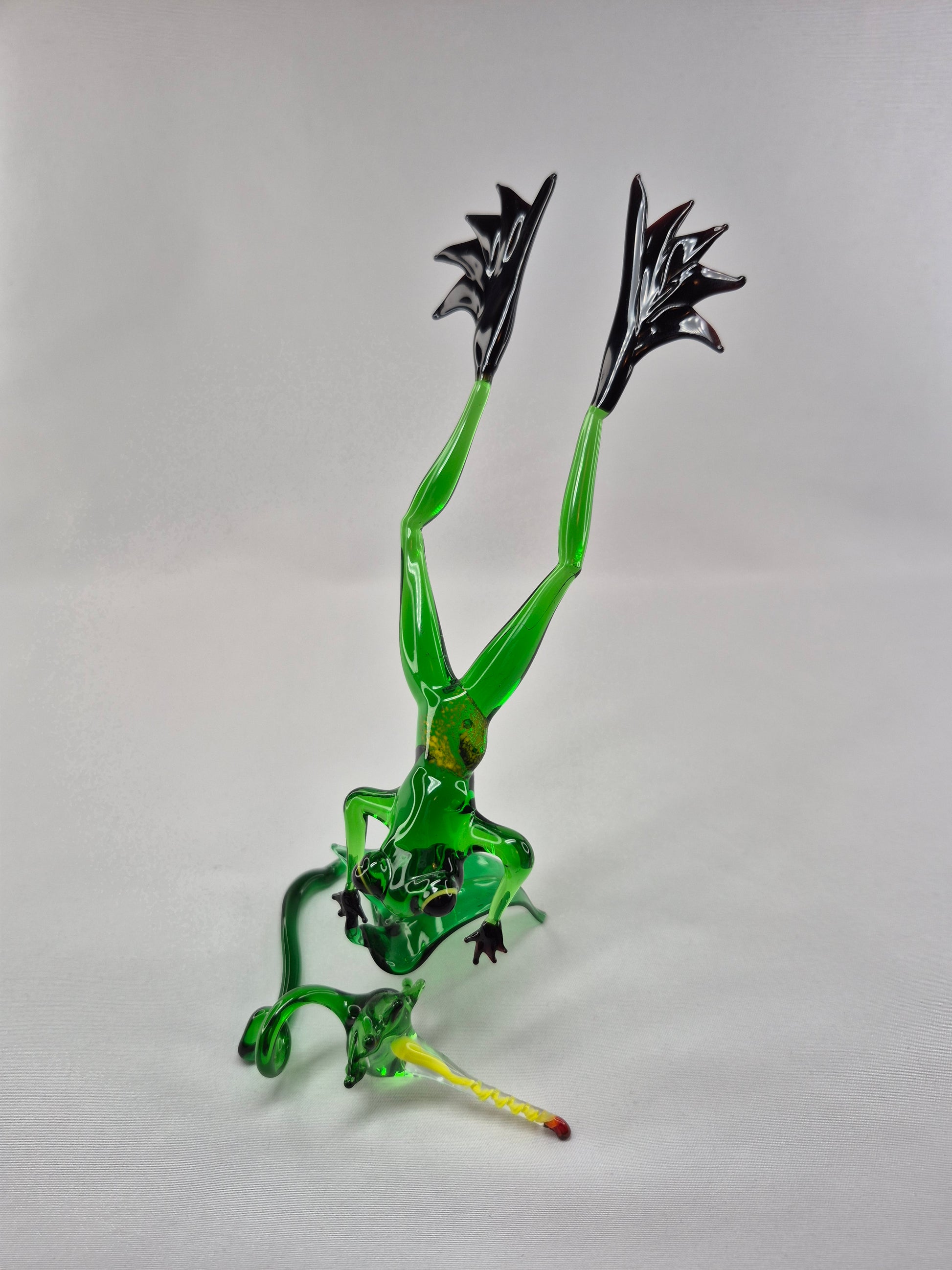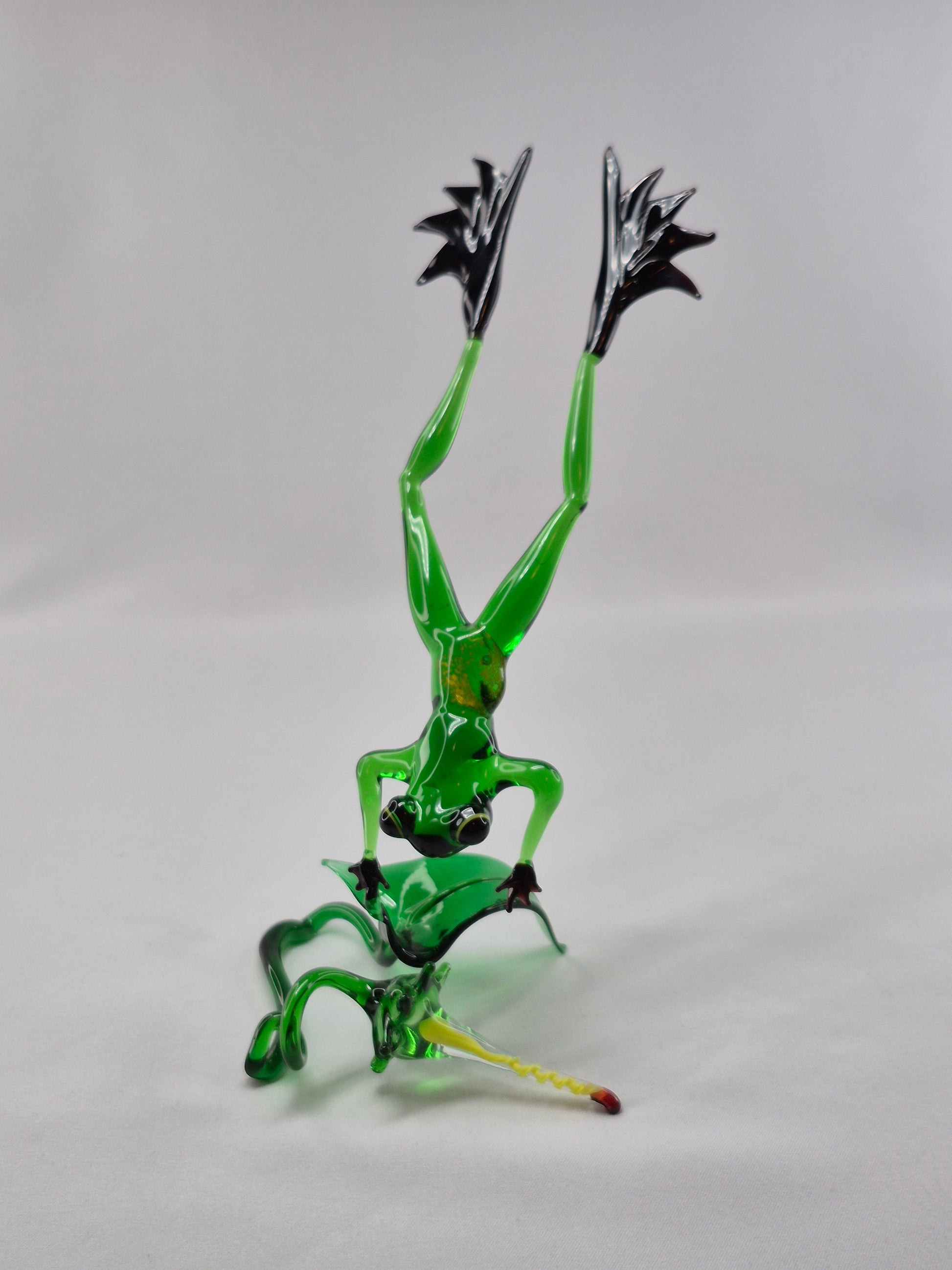 A stunning green glass frog jumping onto a flower, handcrafted in the lampwork technique, where glass rods are melted in an open flame and shaped by hand without molds.