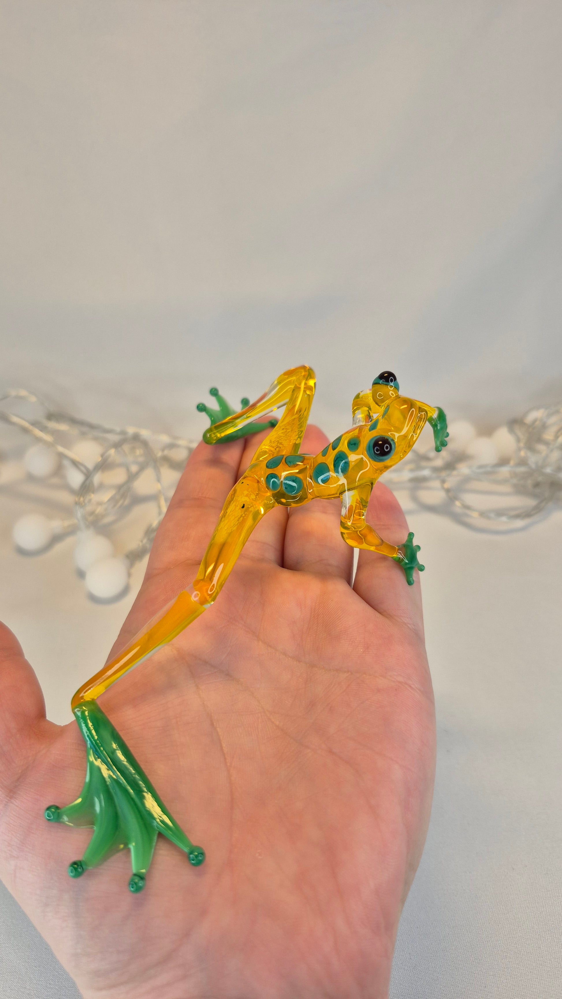 A glass frog hunter. Handmade in the lampwork technique — a traditional glassworking method where glass rods are heated in an open flame and carefully shaped by hand with special tools. This technique allows the creation of detailed and expressive figurines without the use of molds, making each piece truly unique.