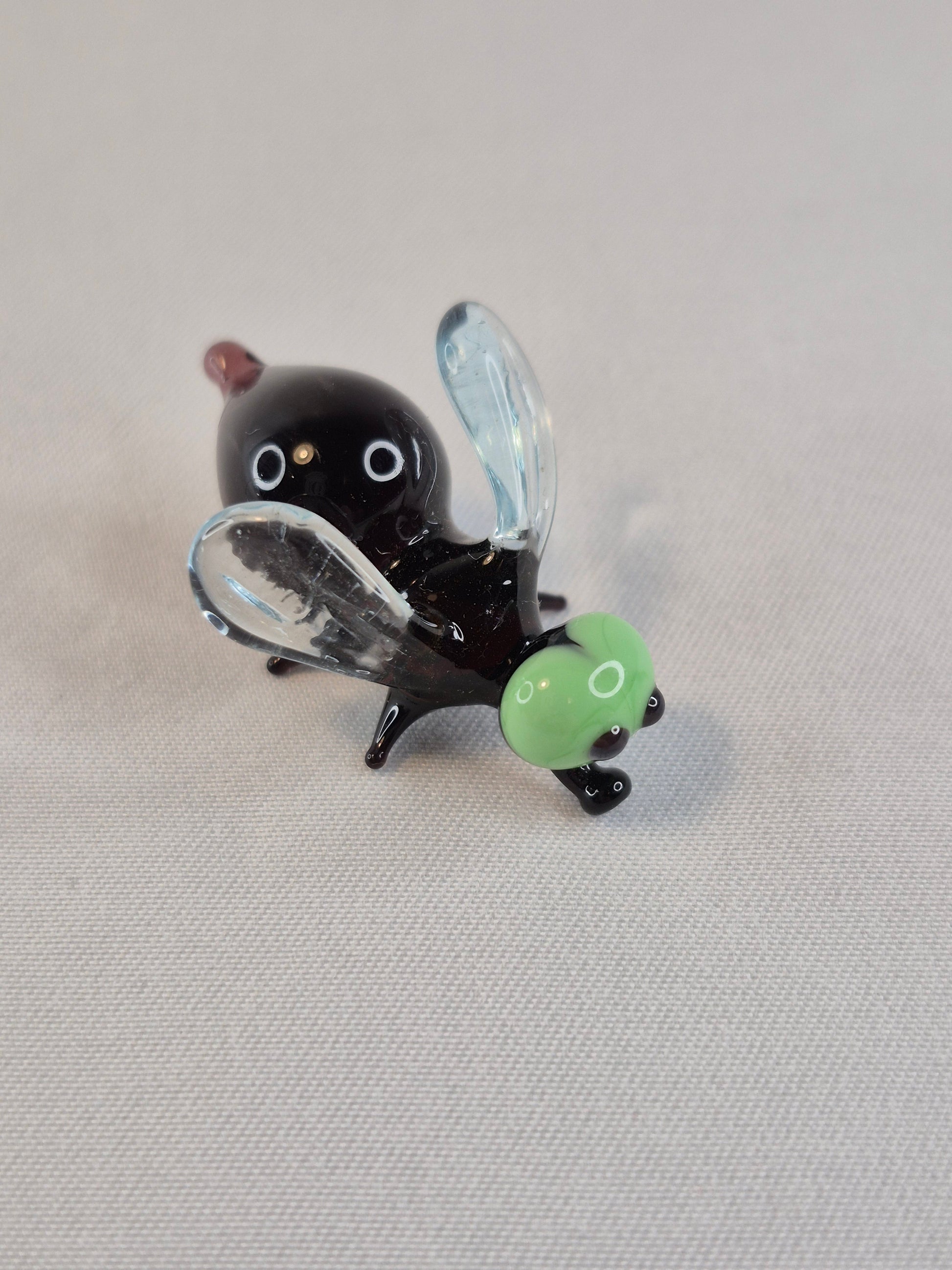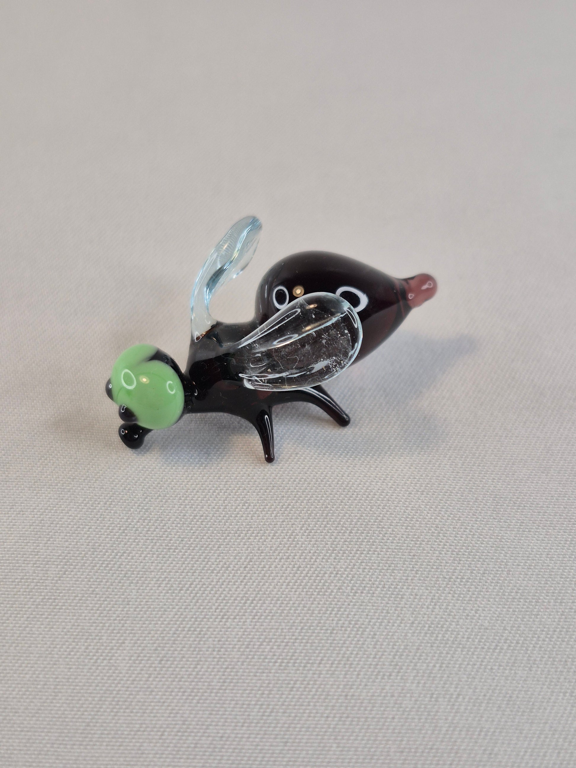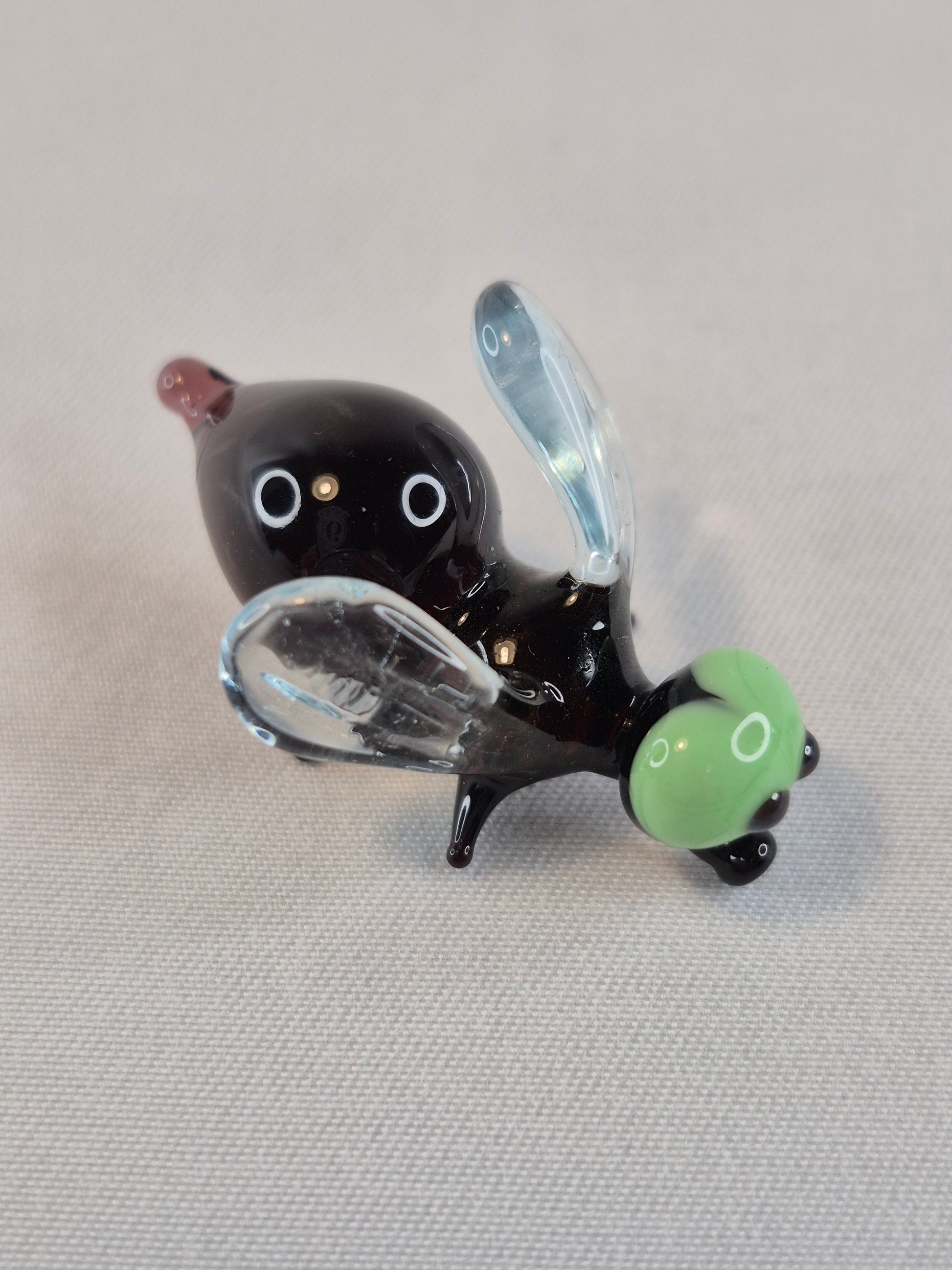 A delicate miniature glass fly, handcrafted in the lampwork technique, where glass rods are melted in an open flame and shaped by hand without molds.