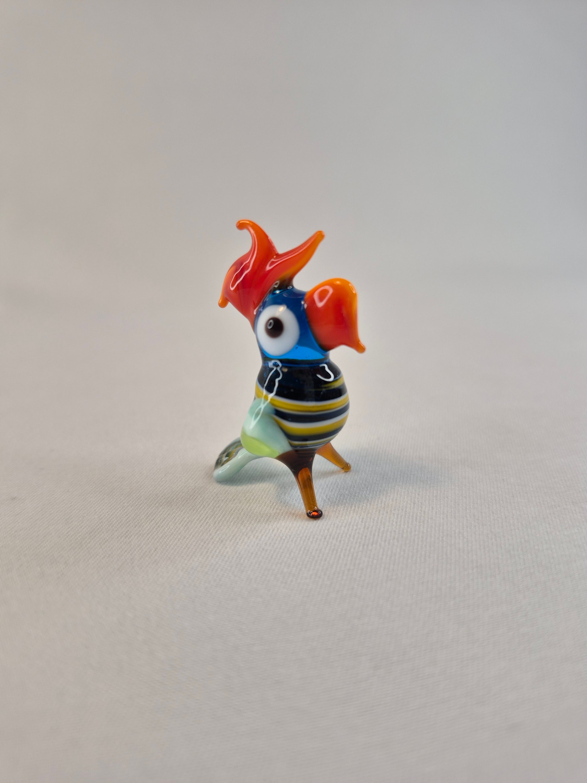 A vibrant miniature glass parrot, handcrafted in the lampwork technique, where glass rods are melted in an open flame and shaped by hand without molds.