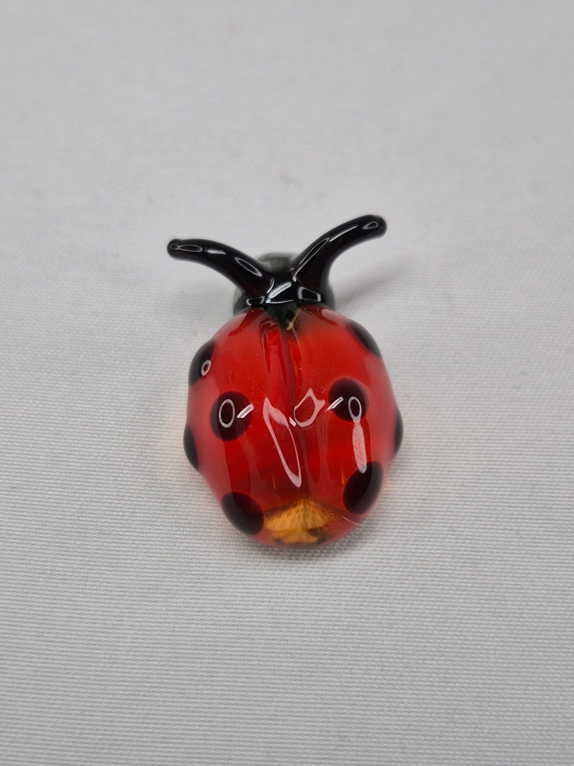 A miniature glowing ladybug figurine, handmade in the lampwork technique, where glass rods are melted in an open flame and shaped by hand without molds. Made from borosilicate uranium glass that meets all EU safety standards and is completely safe.