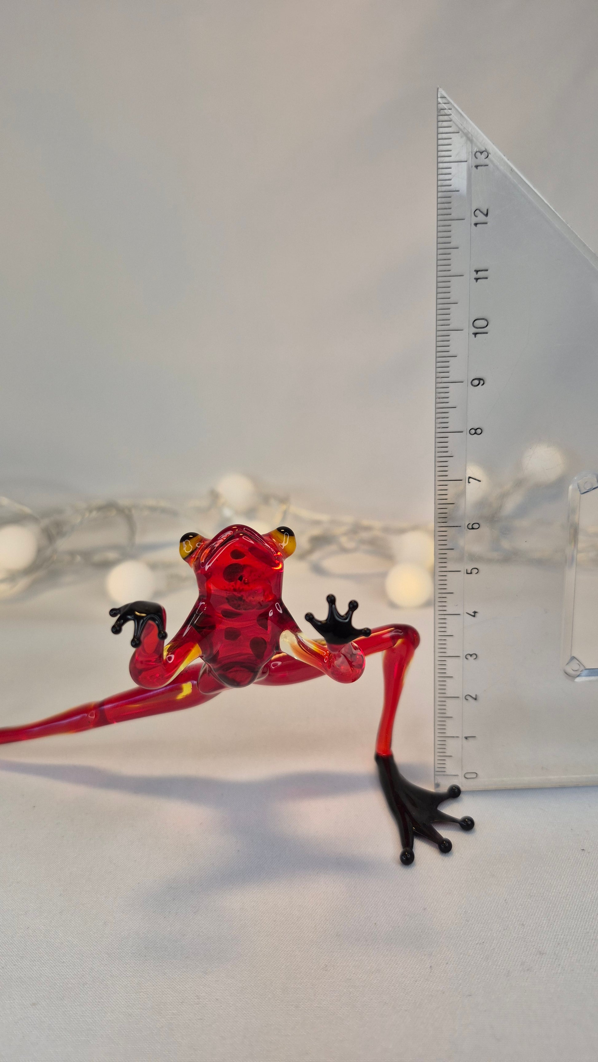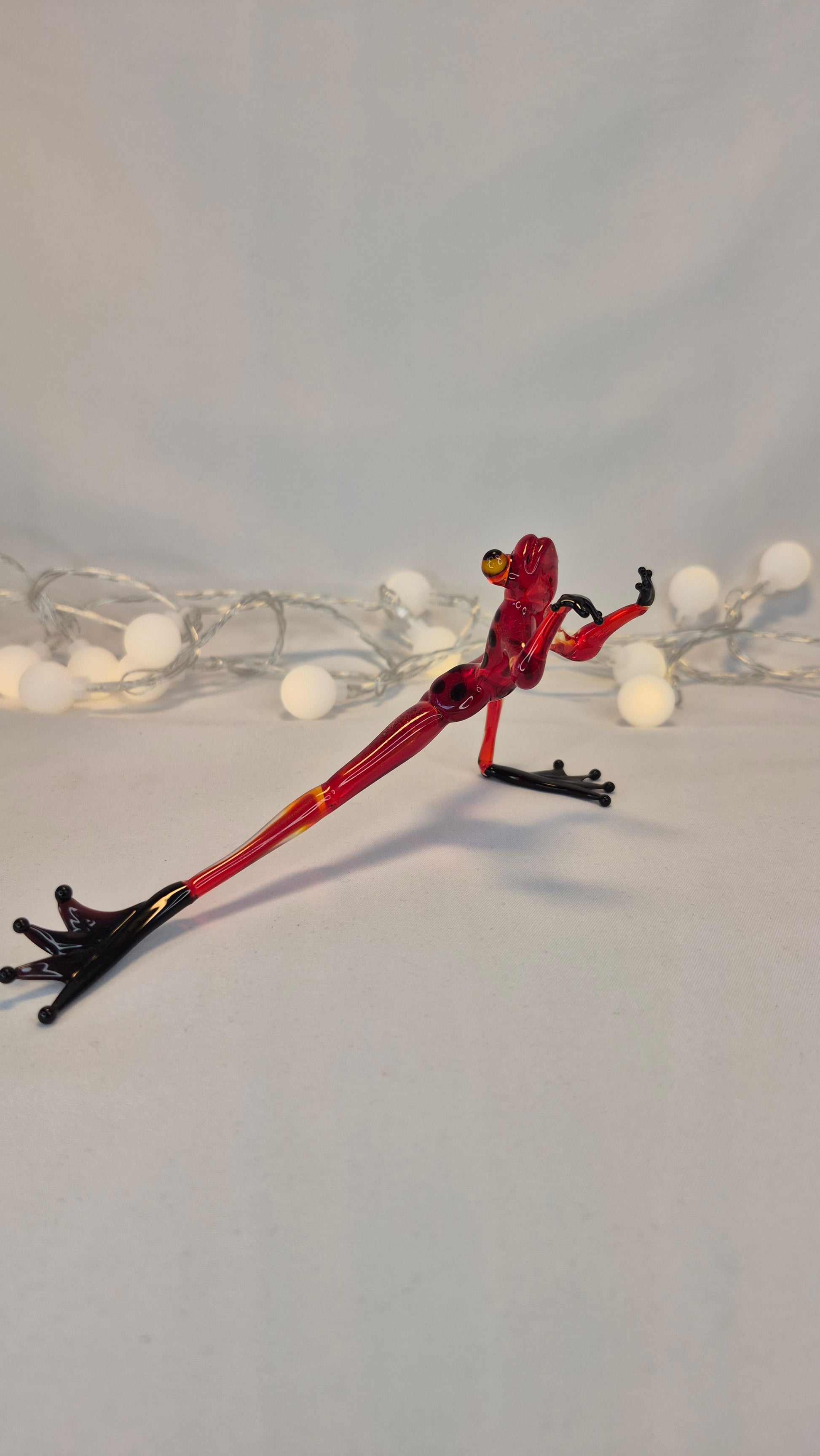 A red glass frog practicing wushu. Handmade in the lampwork technique — a traditional glassworking method where glass rods are heated in an open flame and carefully shaped by hand with special tools. This technique allows the creation of detailed and expressive figurines without the use of molds, making each piece truly unique.