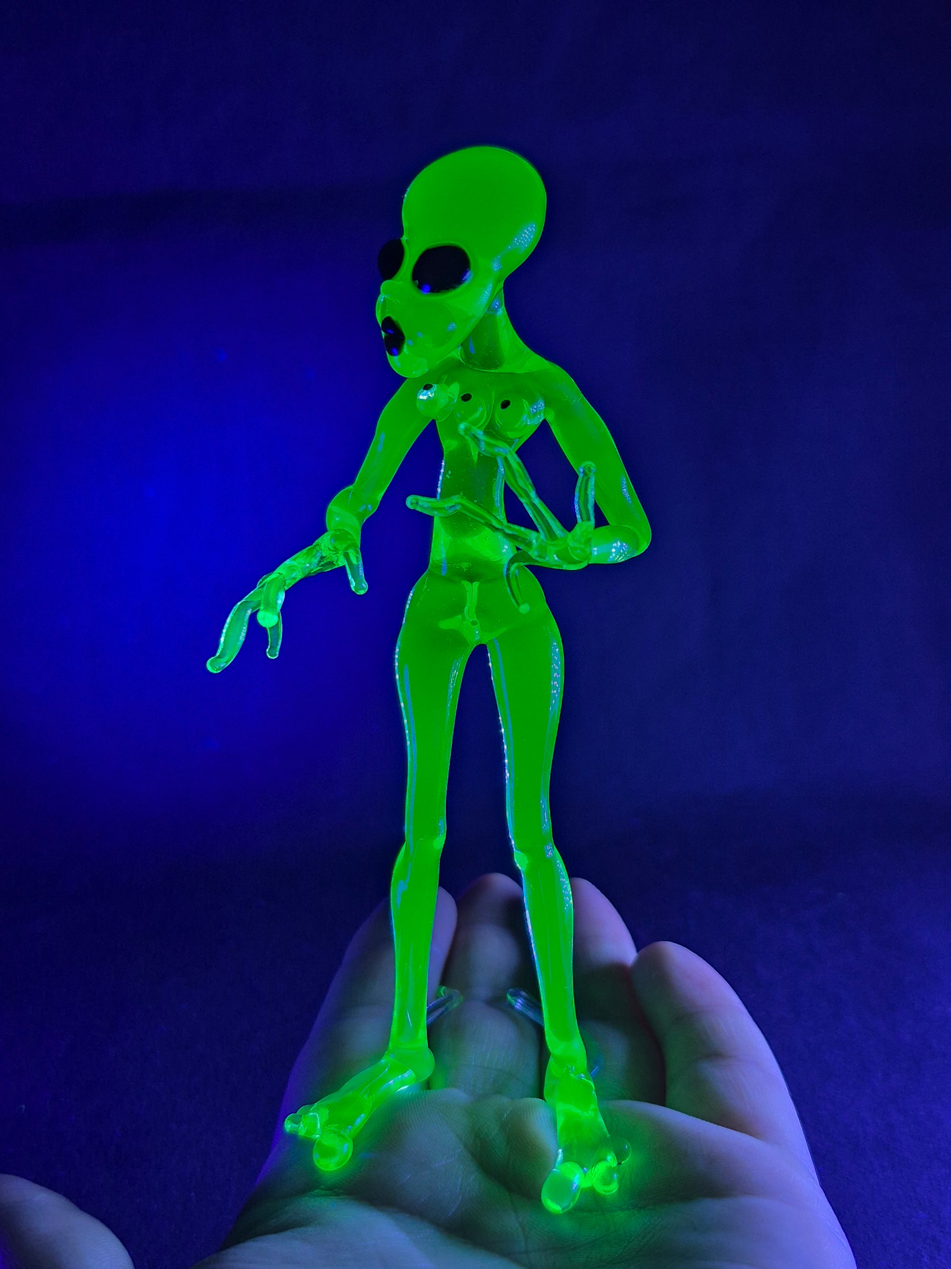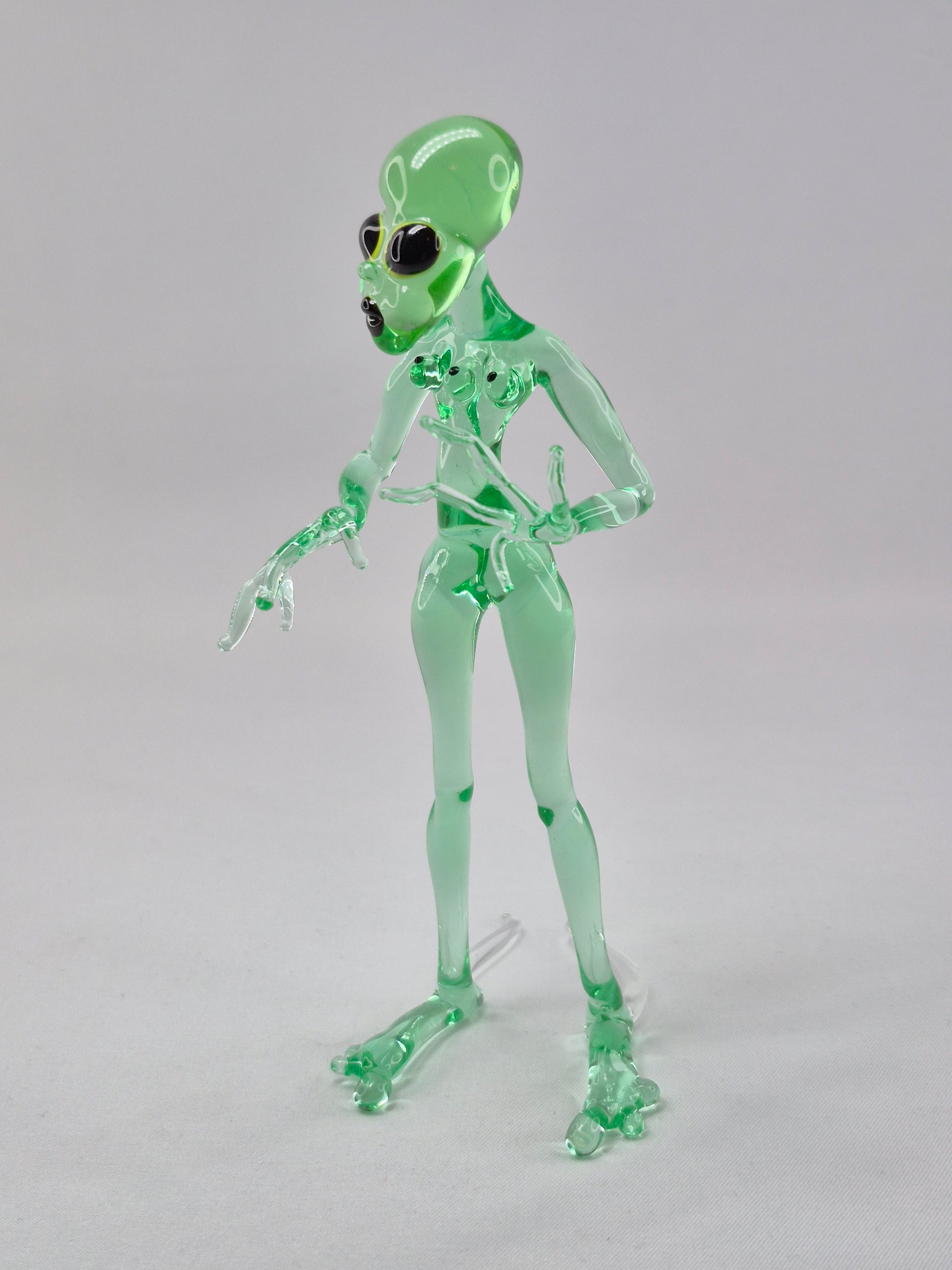 A unique female alien figurine made from uranium borosilicate glass, handcrafted in the lampwork technique, where glass rods are melted in an open flame and shaped by hand without molds. The figure glows beautifully under ultraviolet light, emitting a bright green light that creates a mysterious and cosmic effect.