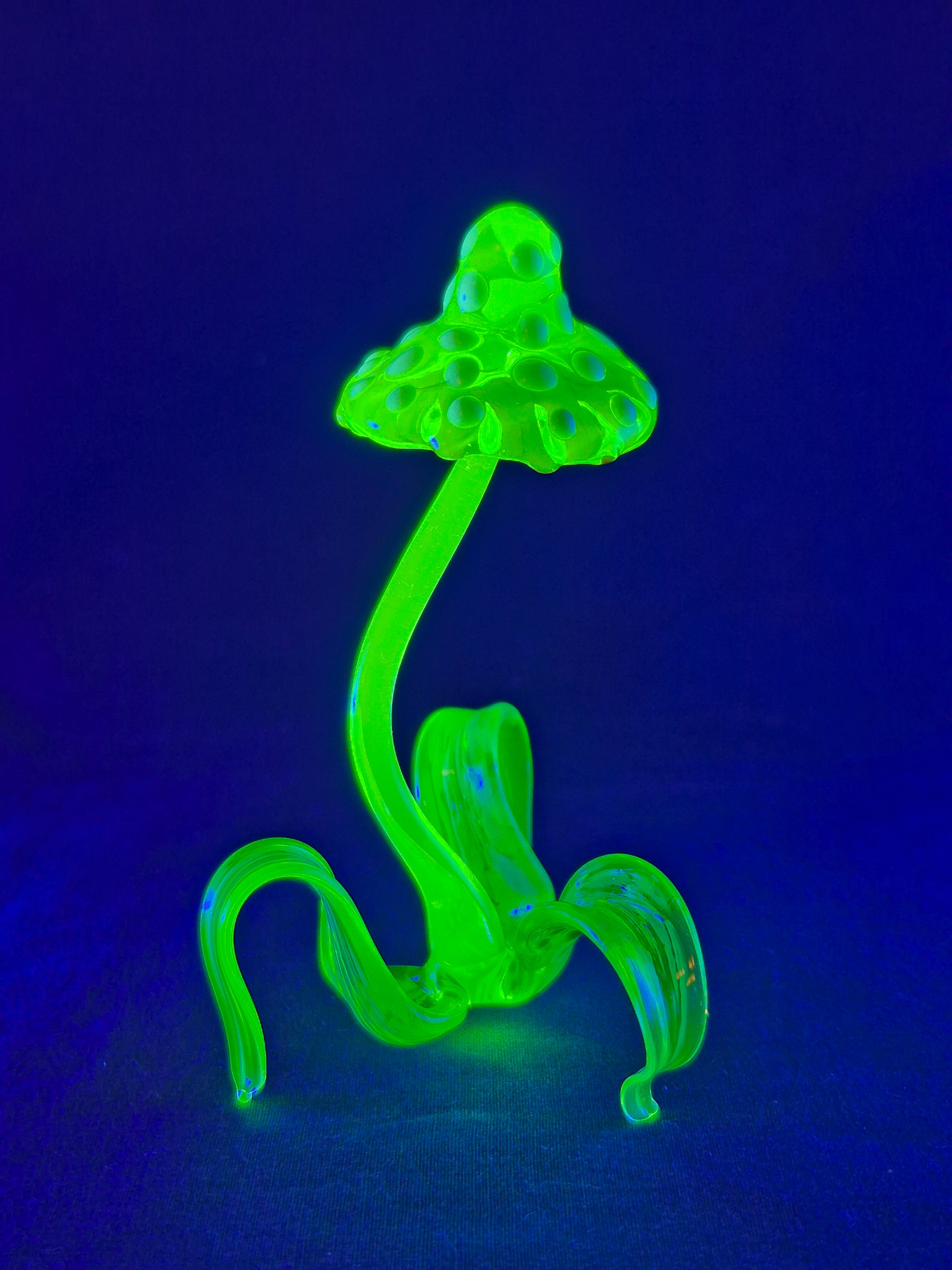 A mushroom amanita made from uranium borosilicate glass, handcrafted in the lampwork technique, where glass rods are melted in an open flame and shaped by hand without molds. The mushroom glows under ultraviolet light, emitting a bright green light that creates a magical and mysterious effect.