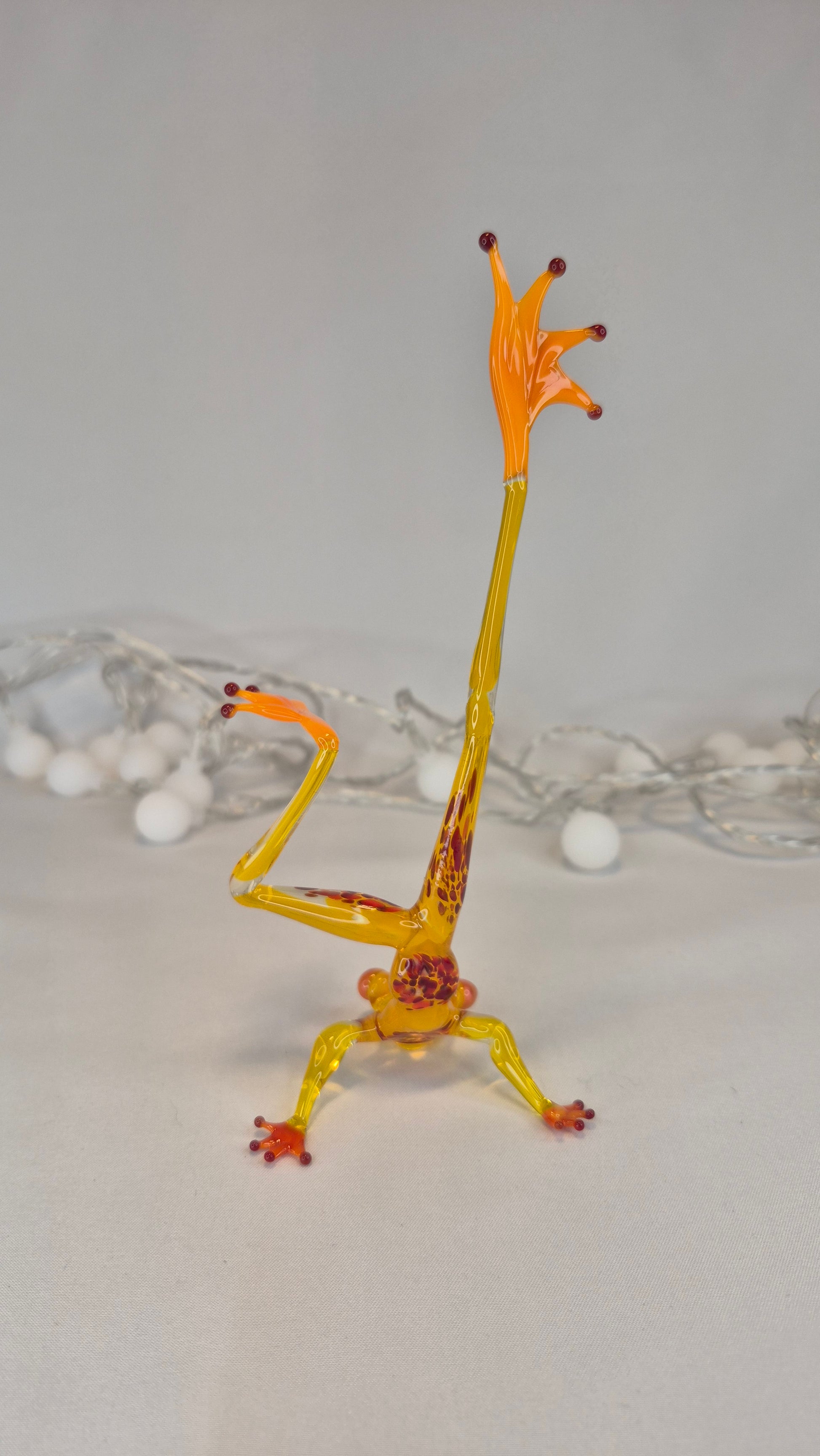 A yellow-orange glass yoga frog. Handmade in the lampwork technique — a traditional glassworking method where glass rods are heated in an open flame and carefully shaped by hand with special tools. This technique allows the creation of detailed and expressive figurines without the use of molds, making each piece truly unique.