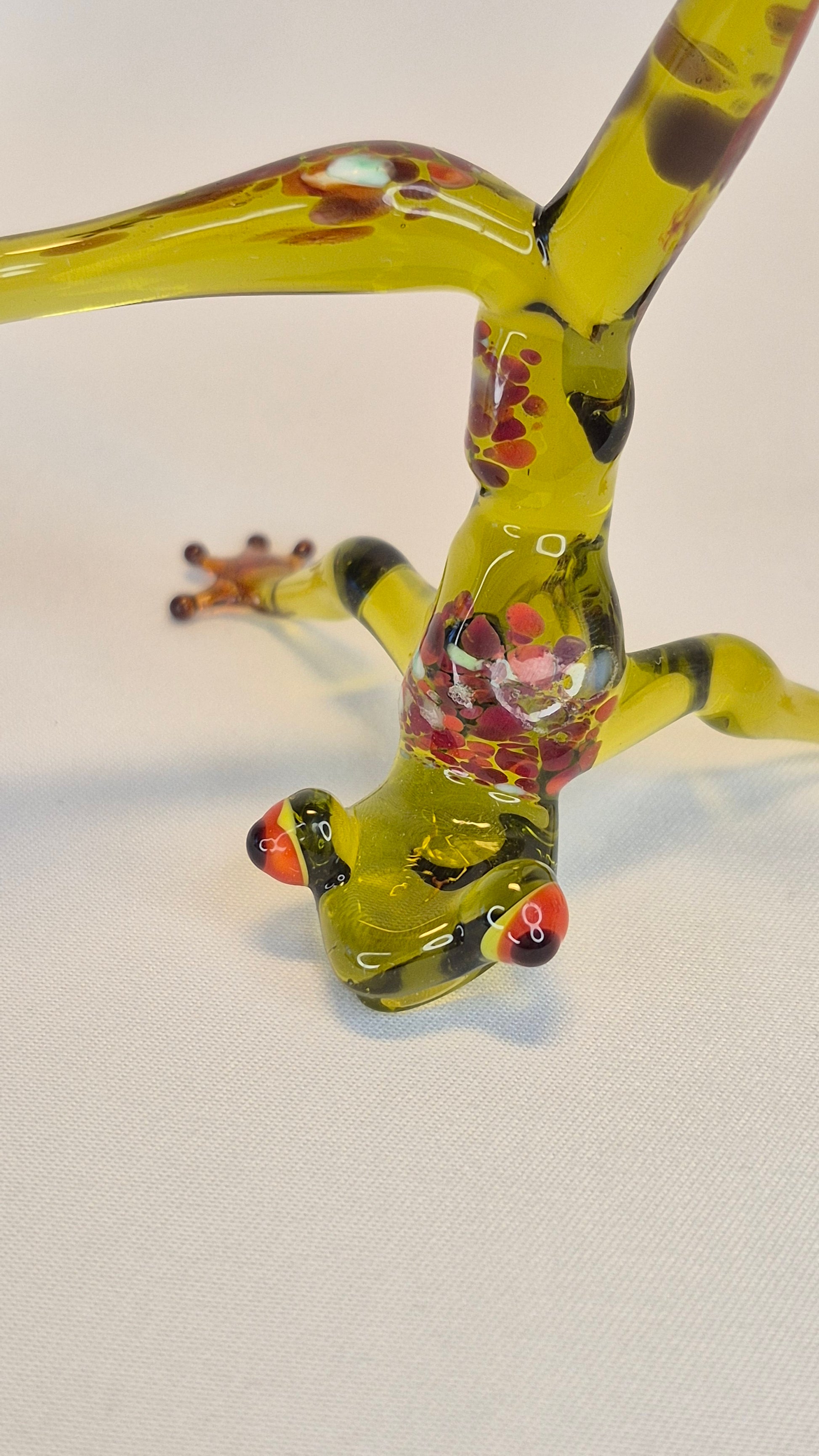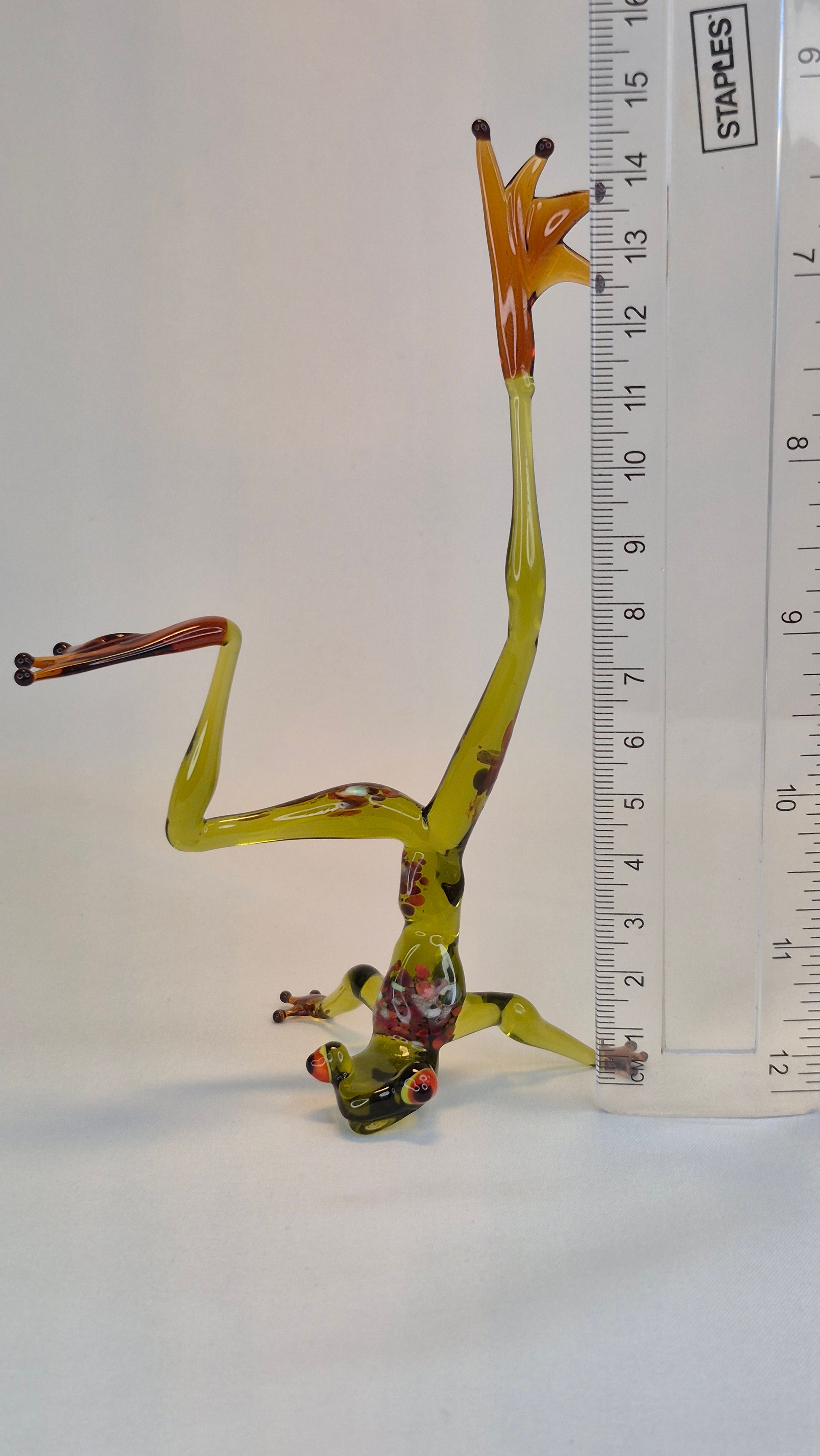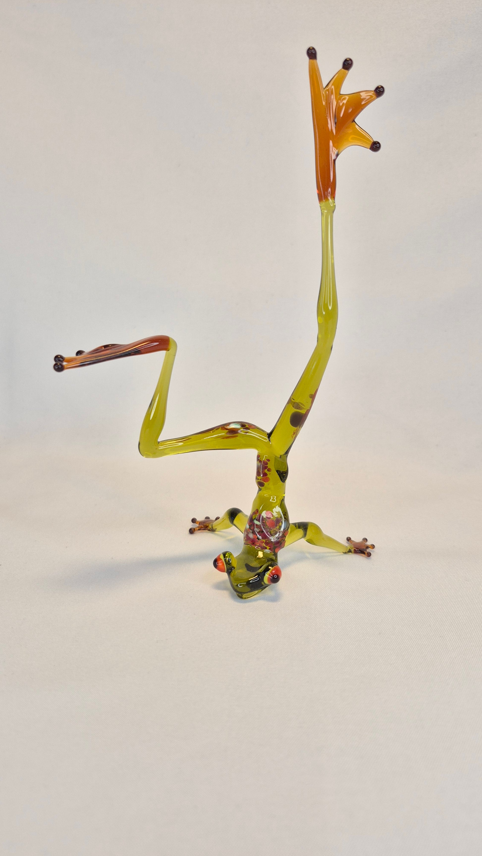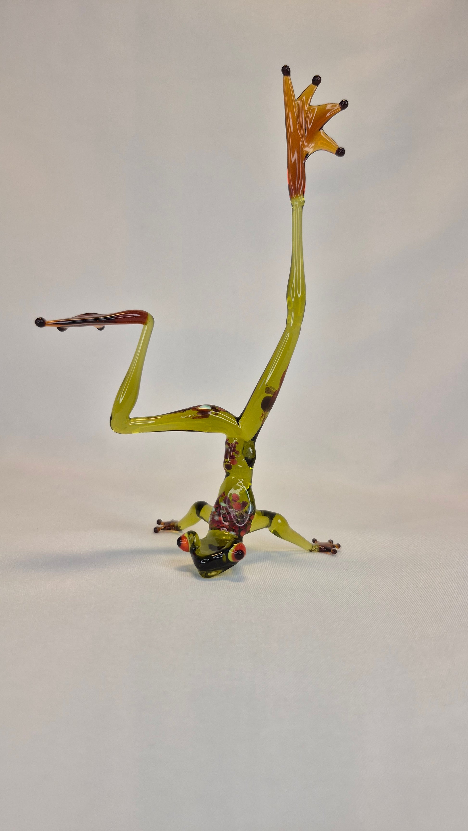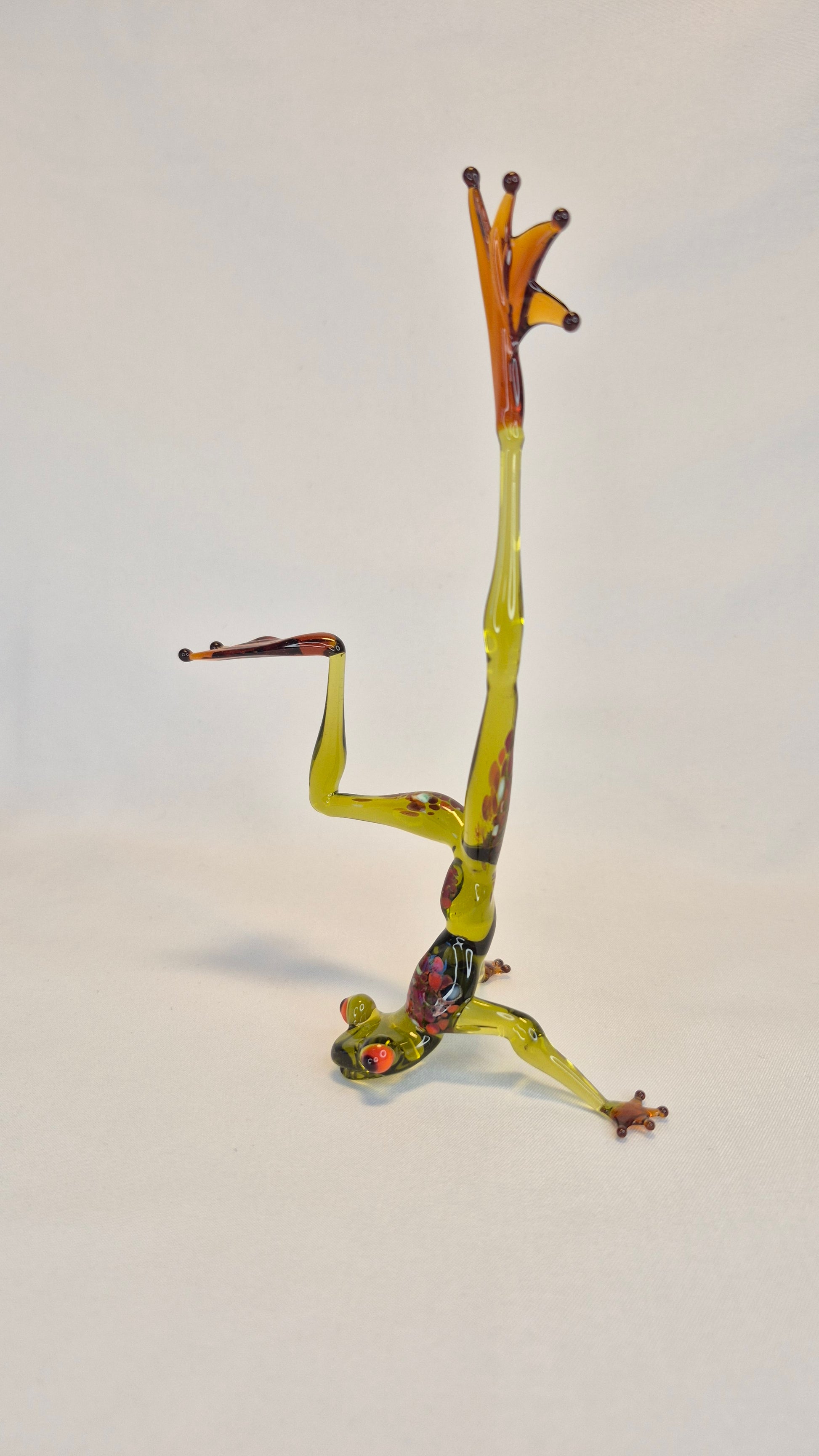 A light green glass yoga frog. Handmade in the lampwork technique — a traditional glassworking method where glass rods are heated in an open flame and carefully shaped by hand with special tools. This technique allows the creation of detailed and expressive figurines without the use of molds, making each piece truly unique.